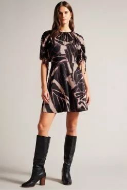 Ted Baker Gilliaa Black Printed Mini Fit And Flare Dress With Puff Sleeve