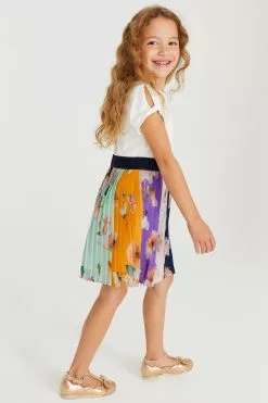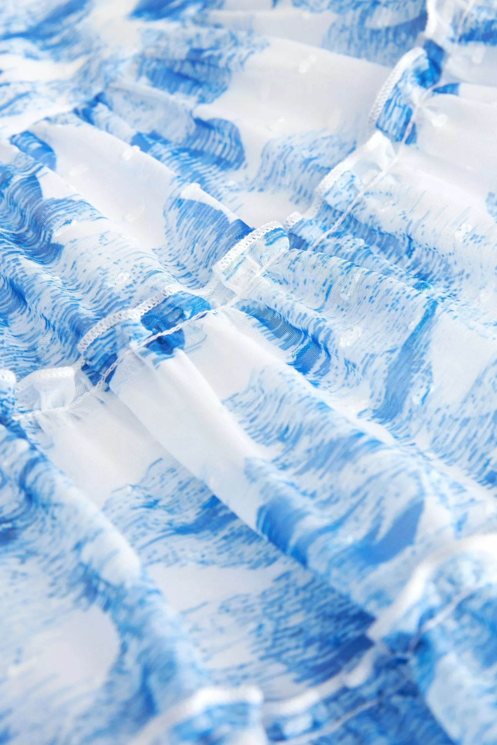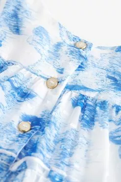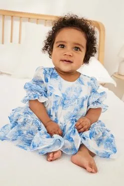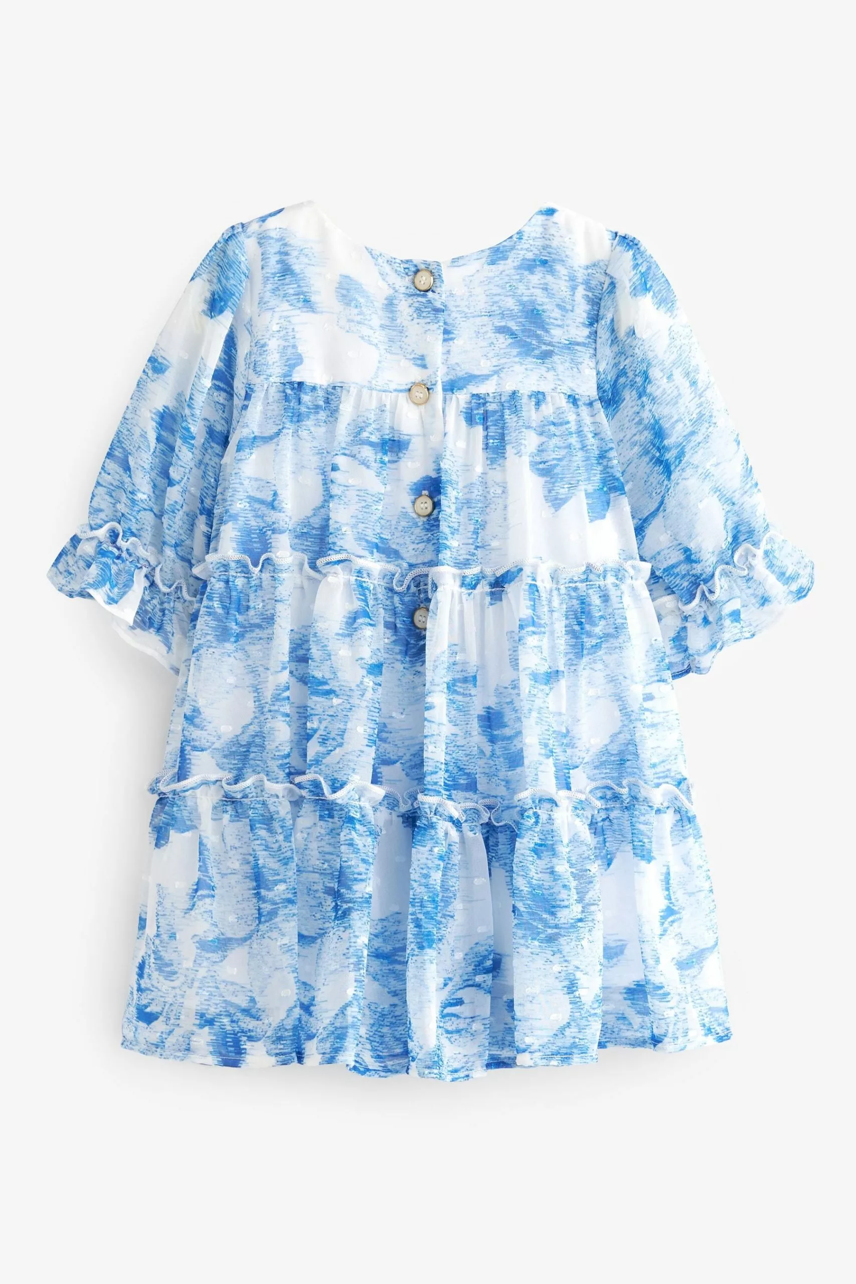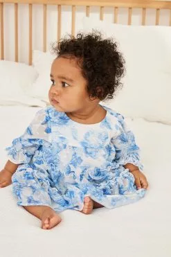 A gorgeous chiffon tiered dress from Baker by Ted Baker designed for your little lady. Boasting a charming all over floral print in blue and white, this floaty dress made from a soft chiffon also has billowing sleeves with a delightful cuff detail and branded button fastenings on the back.
