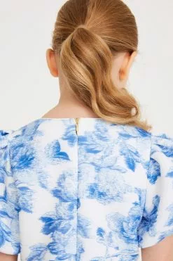 Your little lady will be the belle of the ball in this adorable party dress from Baker by Ted Baker. Made from a structured scuba fabric that decorated all over with a beautiful blue and white floral print, this cute dress also has oversized puff sleeves, a full skirt and a concealed zip fastening at the back.