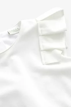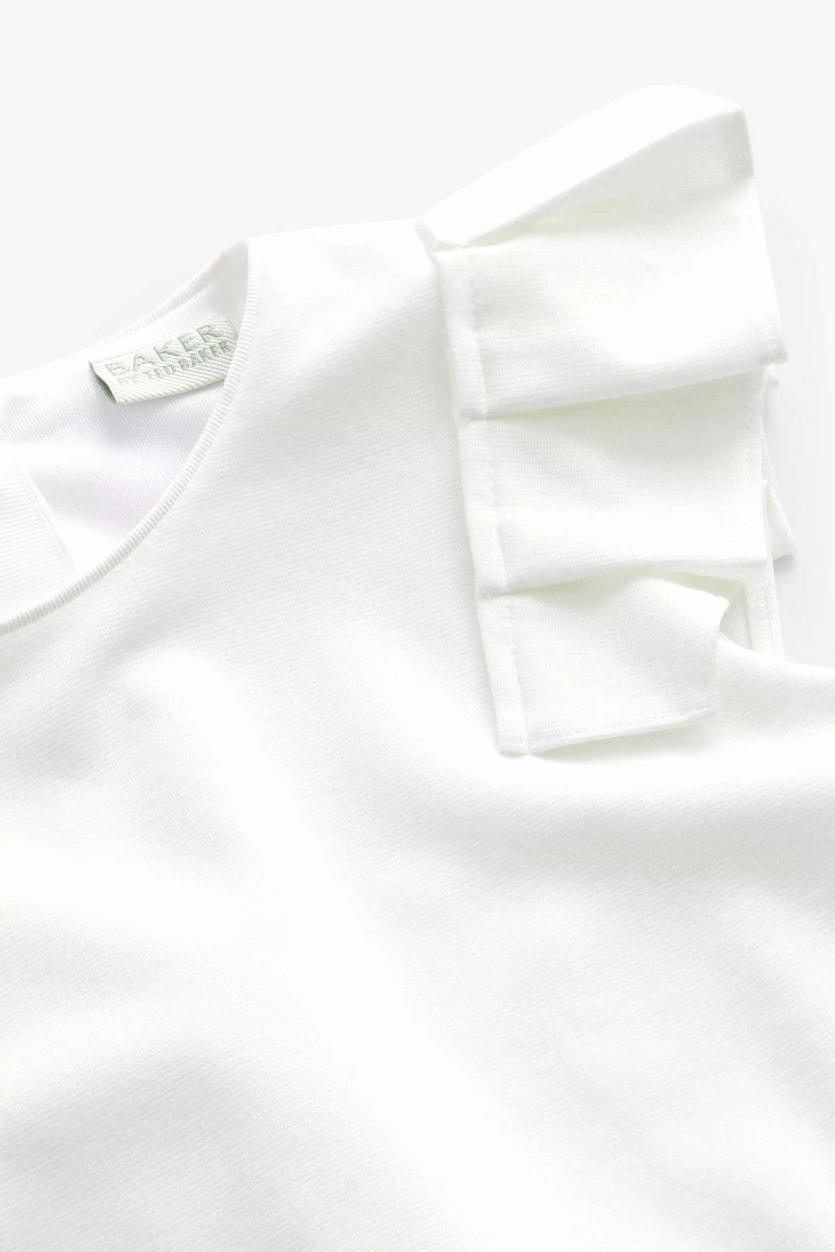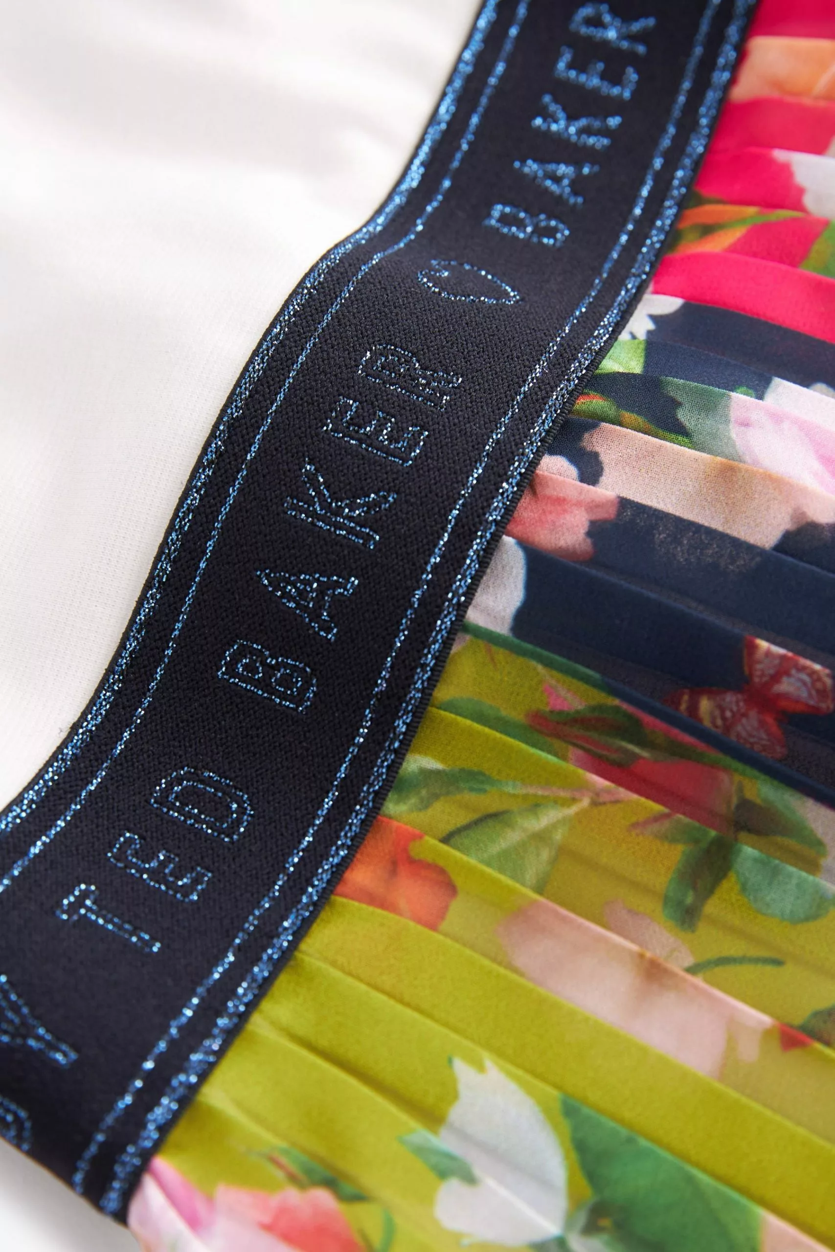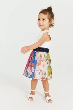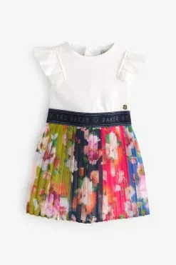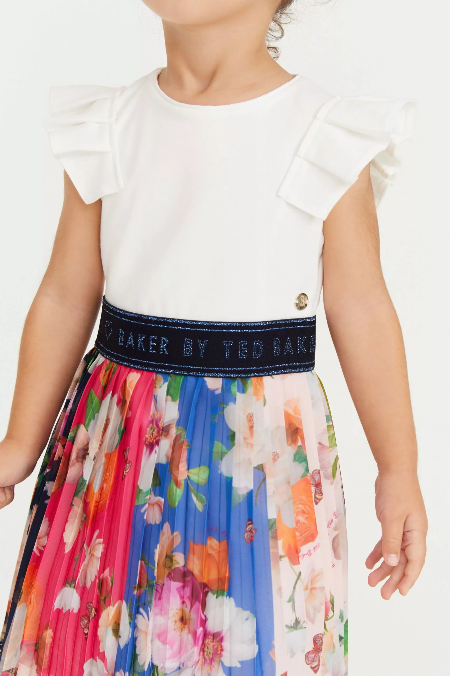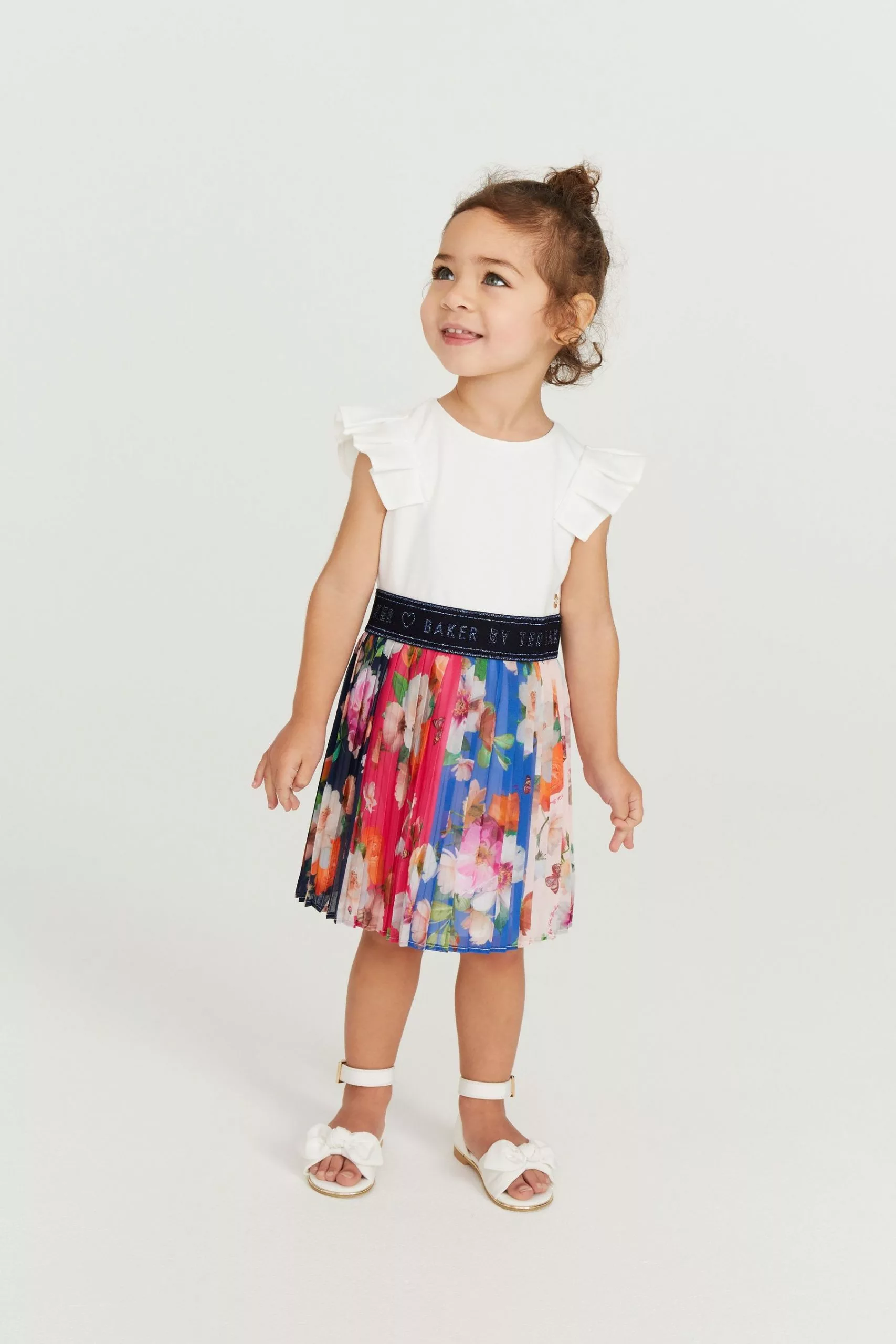 Complete her party wardrobe with this adorable dress from Baker by Ted Baker. Boasting an eye-catching printed and pleated skirt, this pretty dress is also complemented with a charming white bodice that has a frilled shoulder detail, gold branded hardware and a sparkly jacquard waistband.