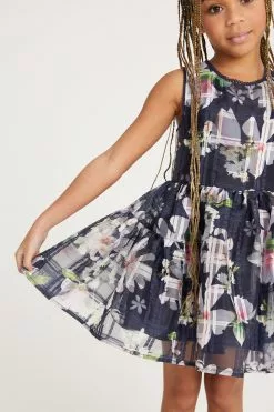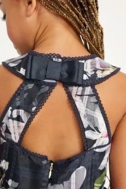 A beautiful dress designed by Baker by Ted Baker for your little girl to enjoy wearing and twirling in. Made from lightweight polyester and lined with cotton, this charming piece in navy is decorated all over with a pretty floral print with a delicate broderie edging. The skirt is layered for fullness and there is a stunning cut out detail at the back with a pretty bow and a concealed zip fastening.