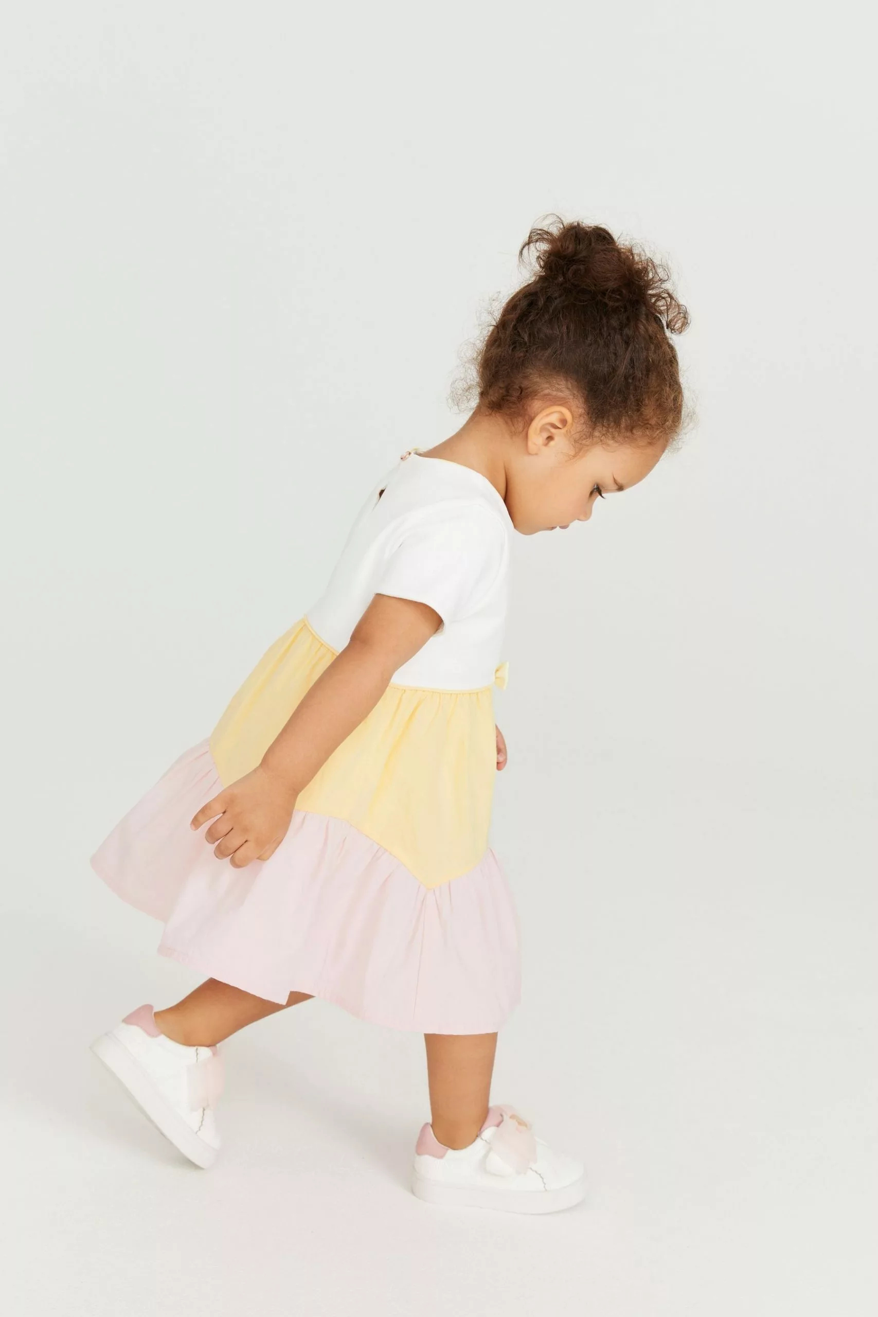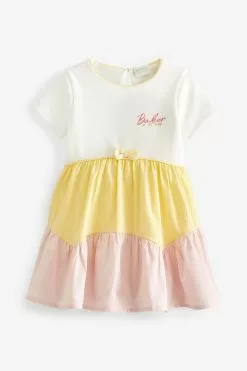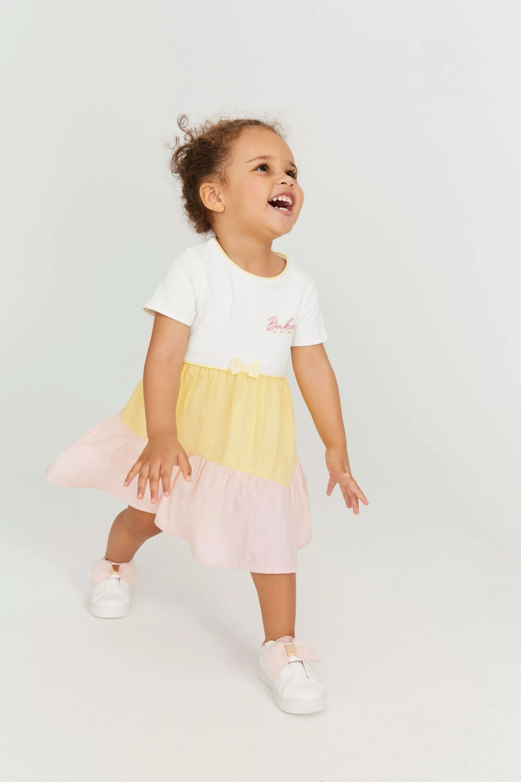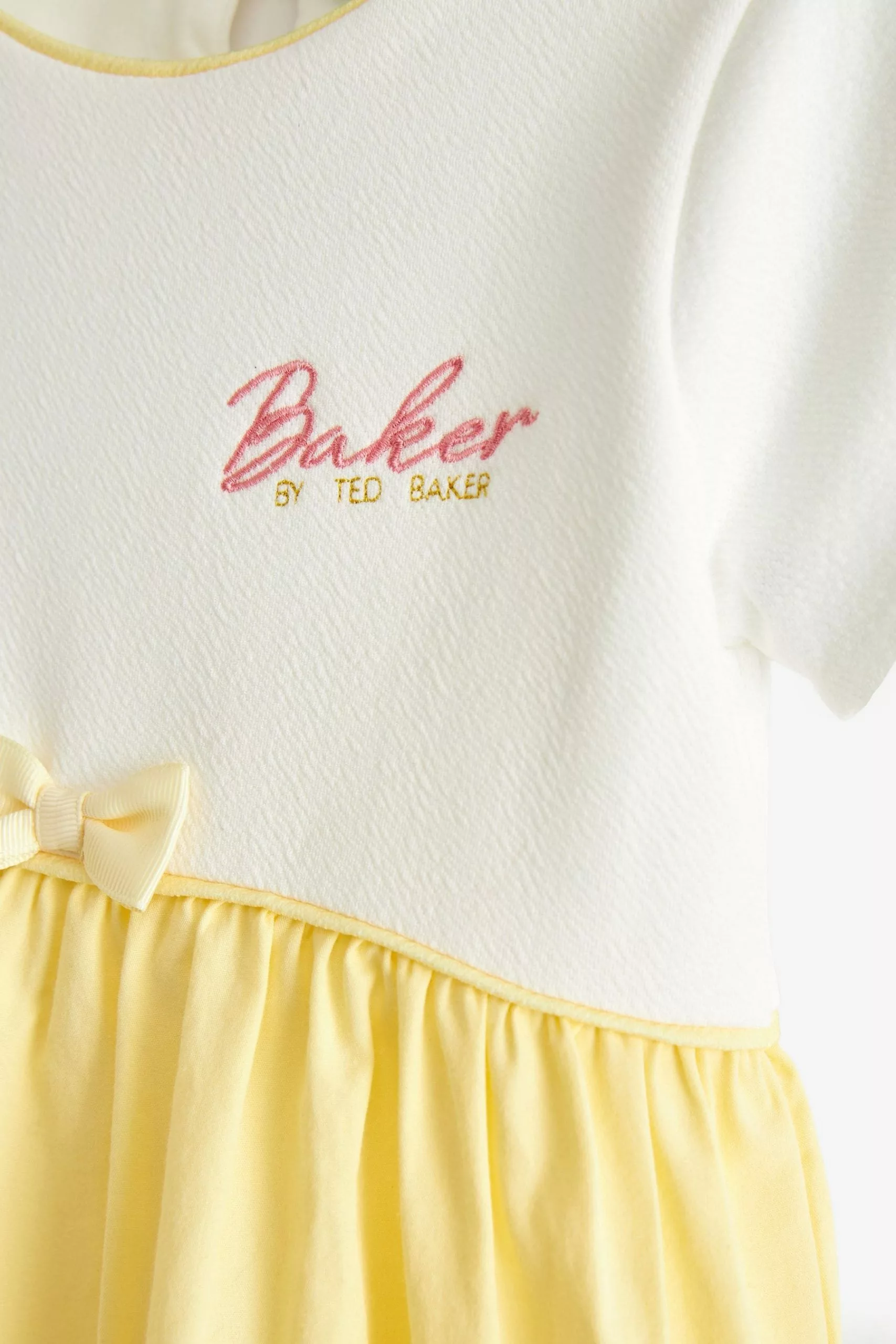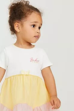 Boasting colour and style, your little lady will love this adorable dress from Baker by Ted Baker. The colour block piece cuts a floaty and loose silhouette that is ideal for warmer days with a pink and yellow striped skirt on the lower half that is complemented with a classic white short sleeve top half. Pretty embroidered branding decorates the chest and this delightful dress is finely finished with yellow edge detailing on the waist and neckline.