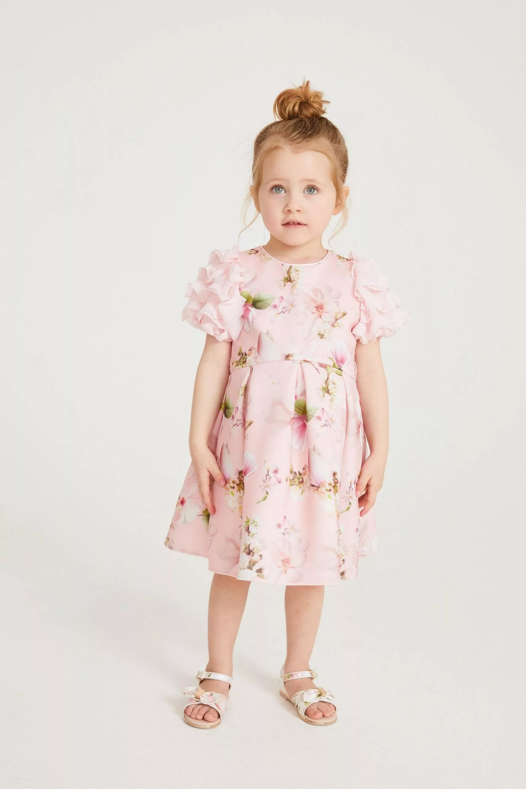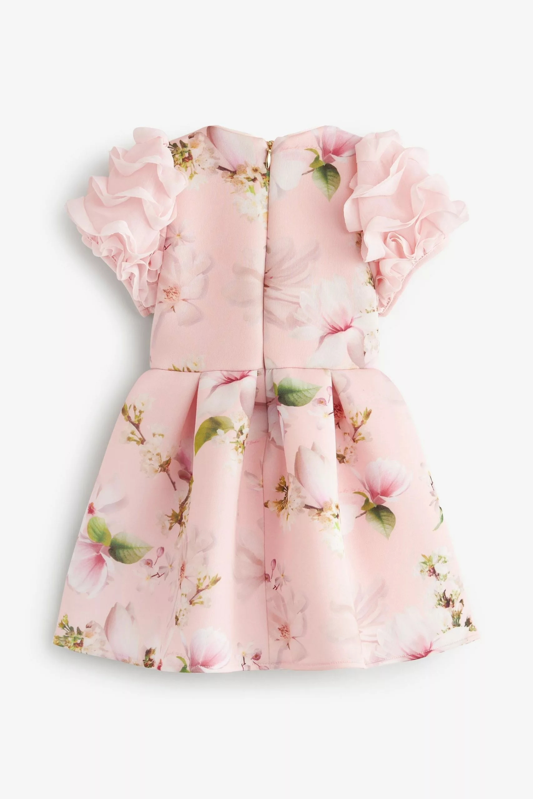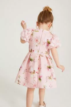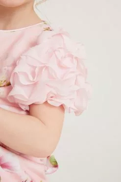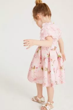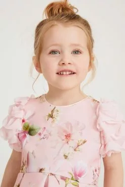 A charming dress made for your little girl from Baker by Ted Baker. Boasting a pretty all over floral print on a pale pink base, this adorable dress features a stunning mesh detail on the shoulders with a full skirt and a concealed zip fastening at the back. She will be the best dressed guest in this gorgeous piece.