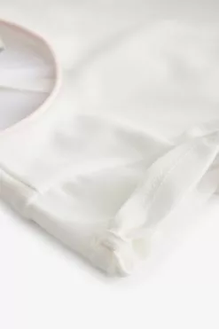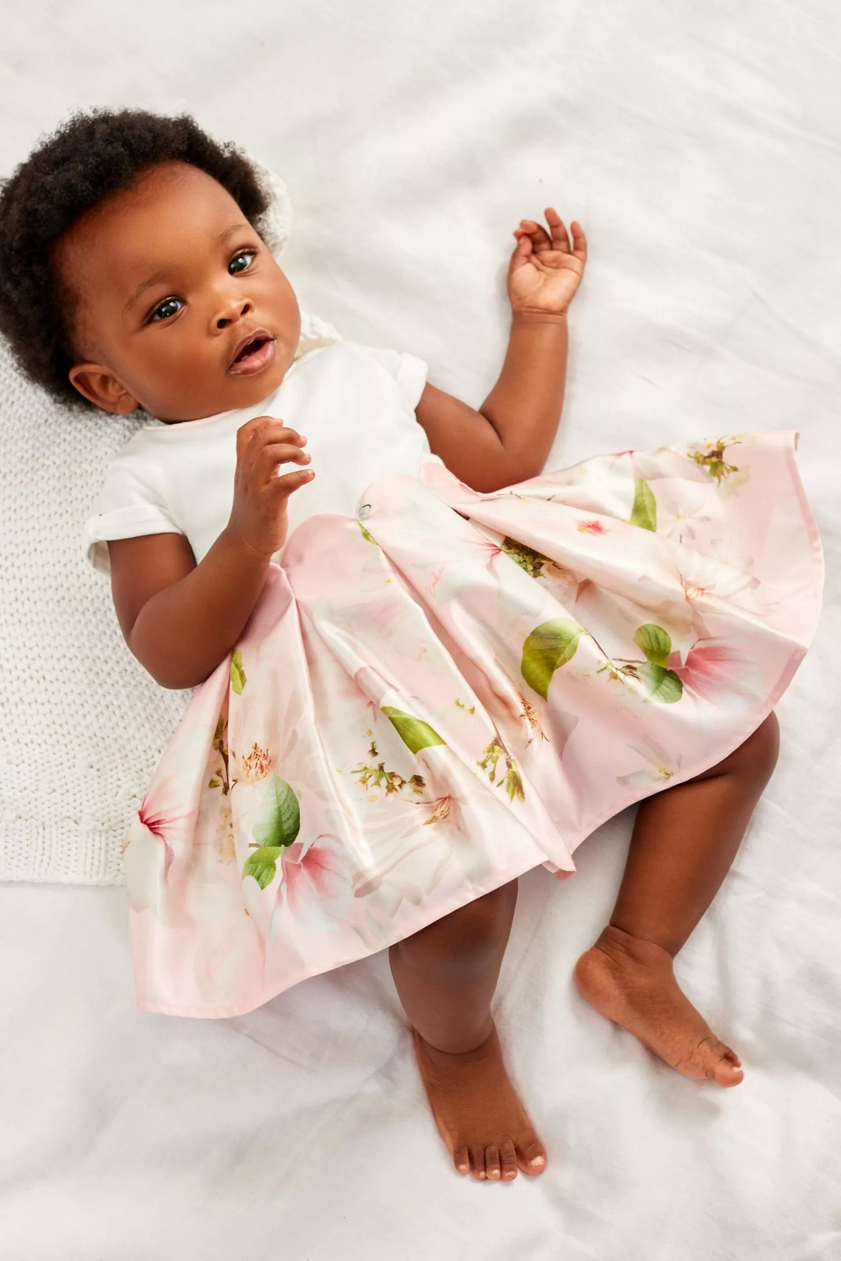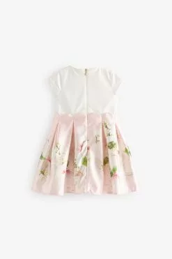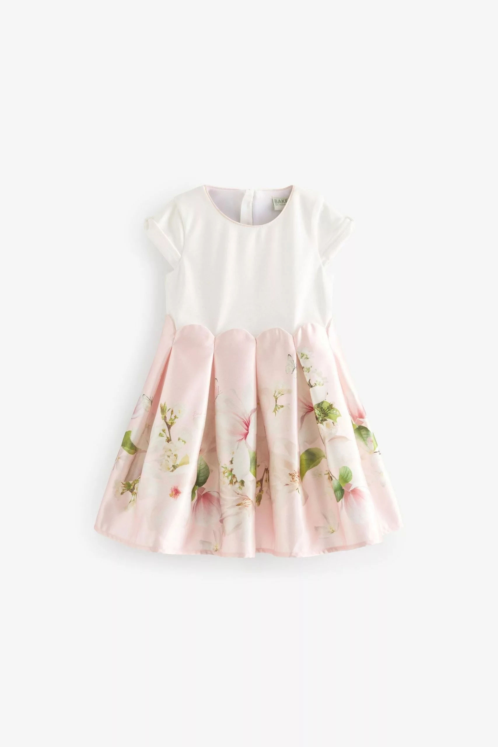 A charming mockable dress designed for your little girl from Baker by Ted Baker. The pretty piece has a classic white top half with little knots on the sleeves and a concealed zip at the back and it is complemented with a satin look skirt that has a scalloped detailing on the waist and is covered with a floral print in pink.
