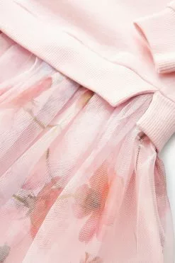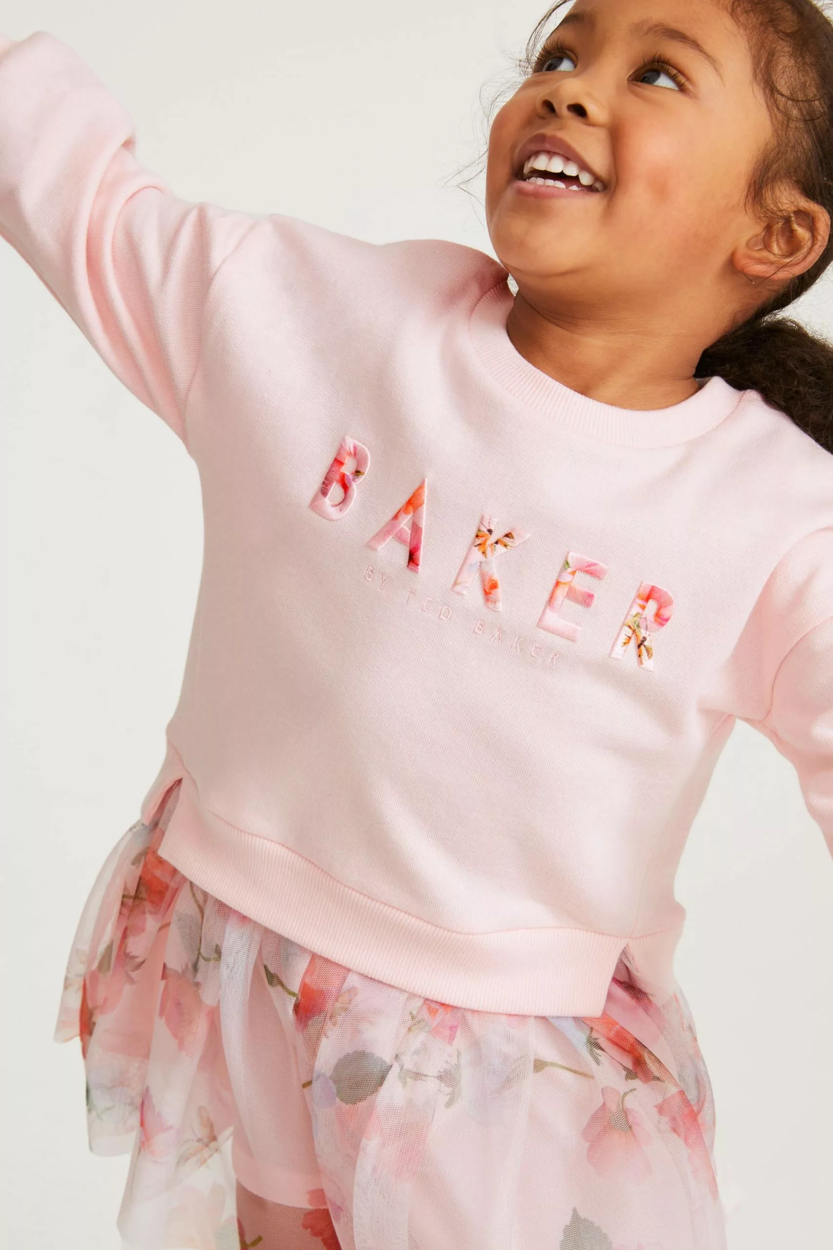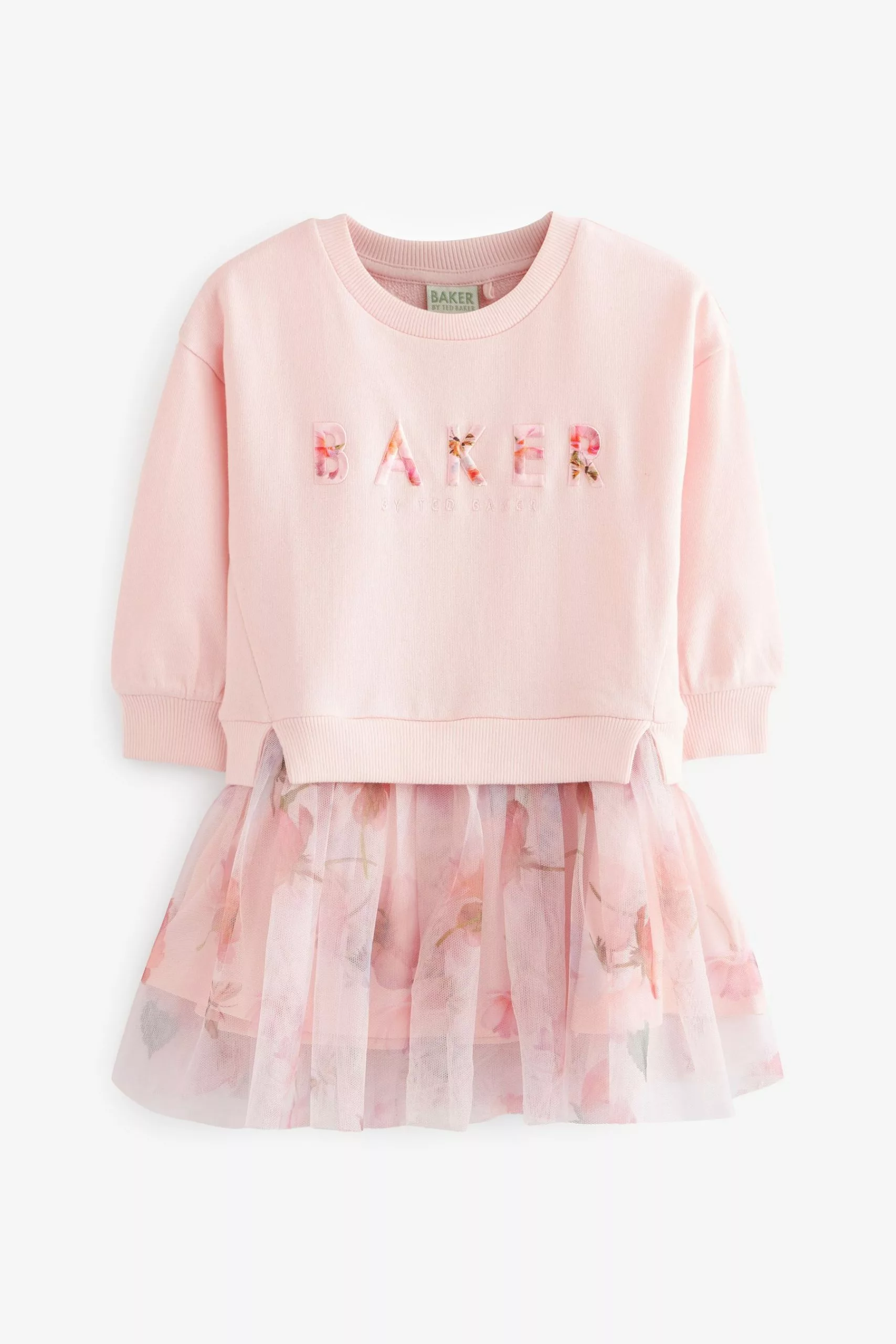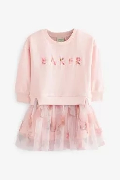 A beautiful dress for your little lady to enjoy wearing this summer from Baker by Ted Baker. The soft pink mockable dress features a sweatshirt top half that has the iconic branding appliquéd across the front and it is finely finished with a delicate mesh net skirt that is decorated all over with a floral print. Team it with a pretty pair of shoes to complete the look.