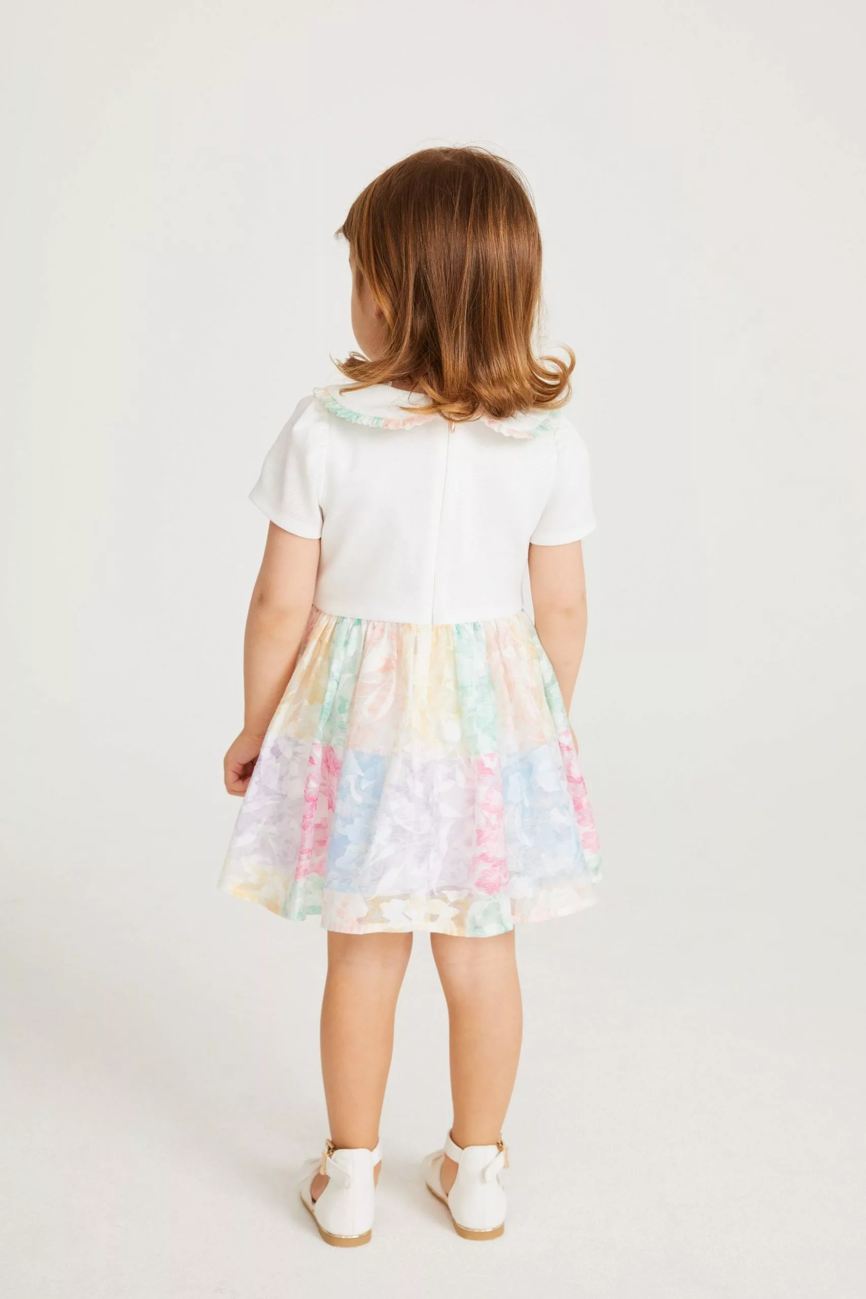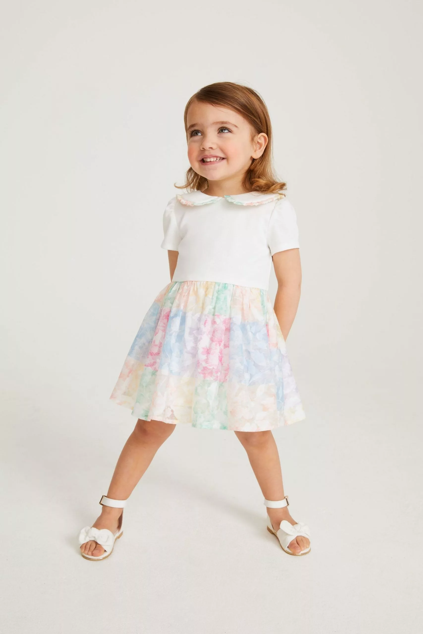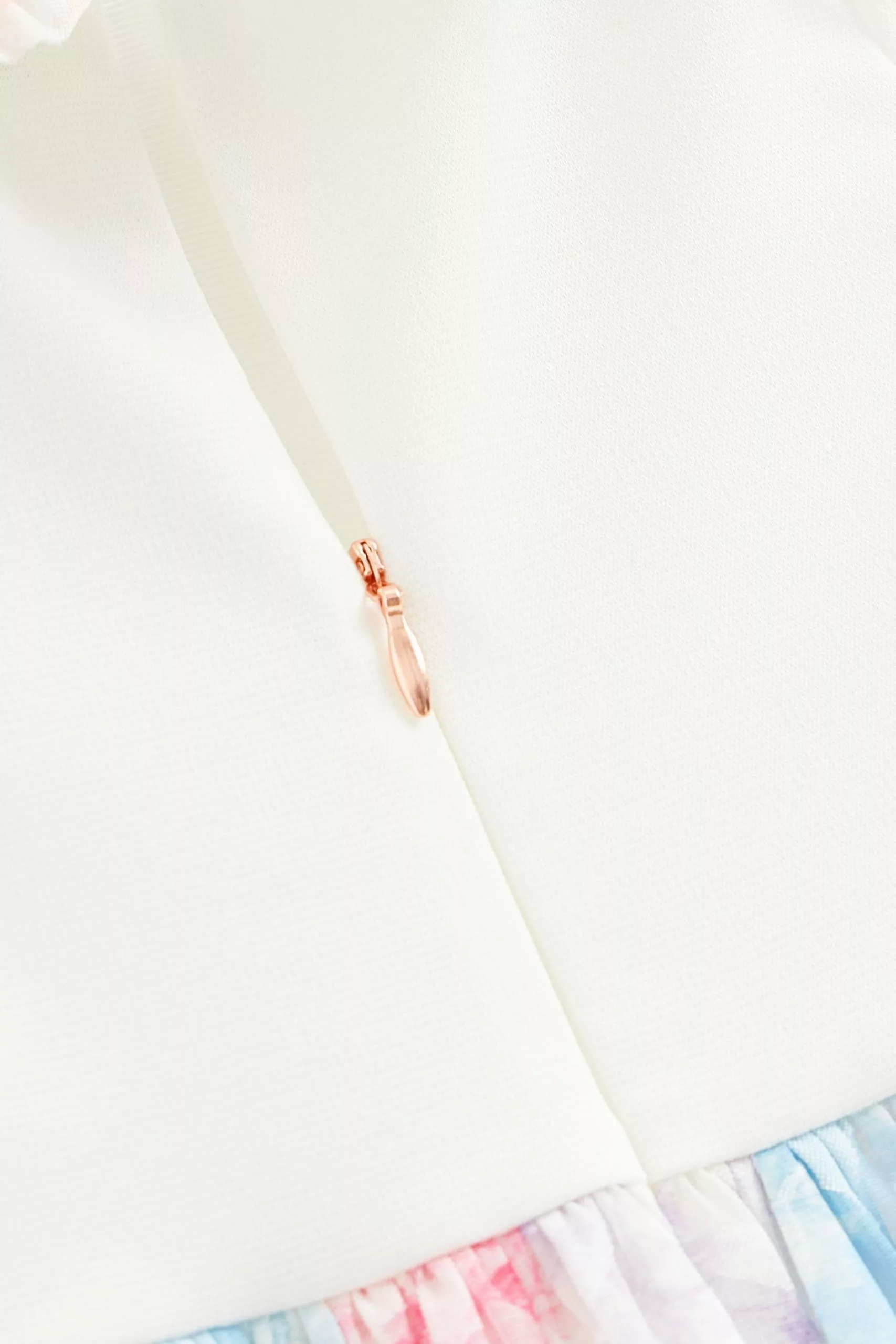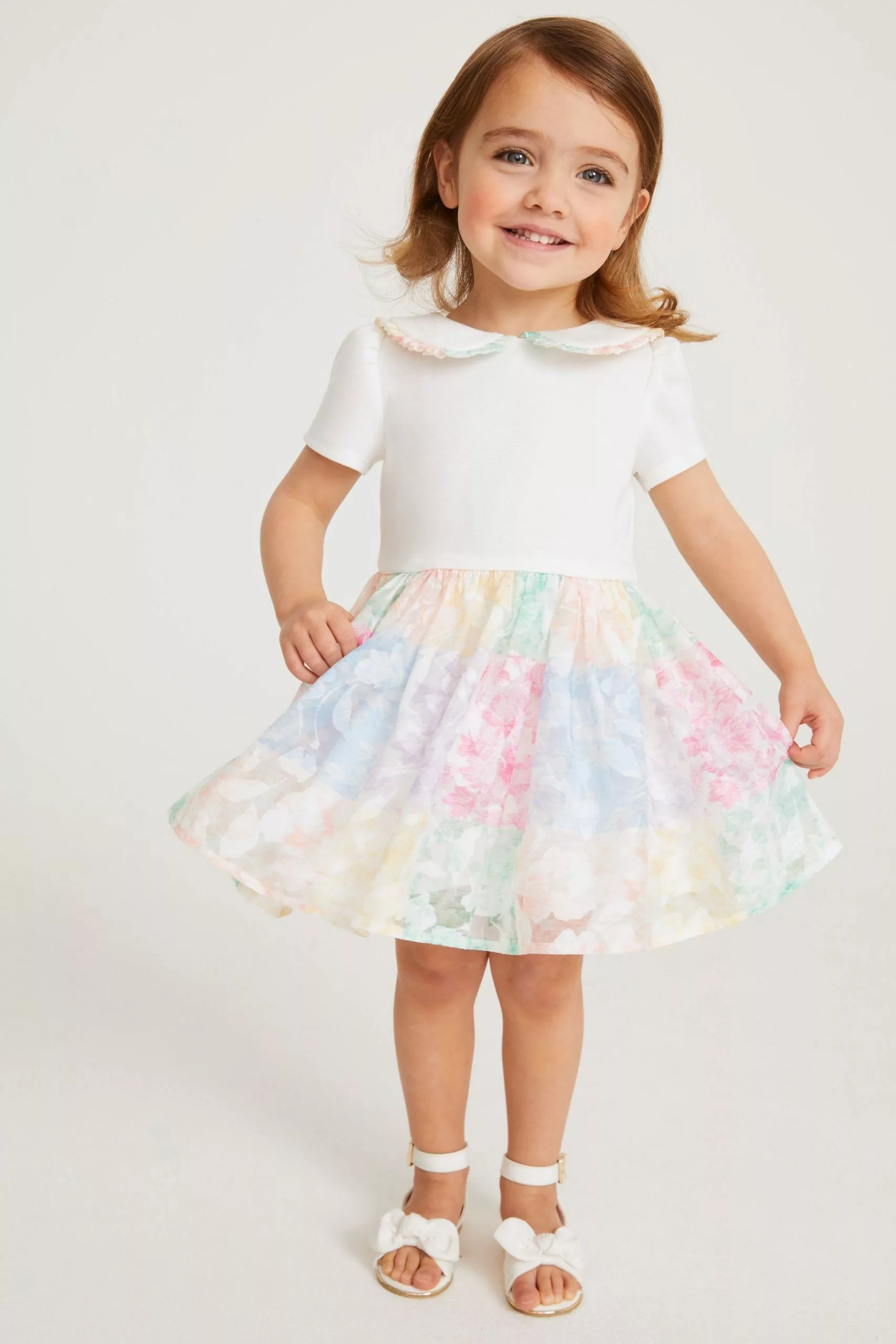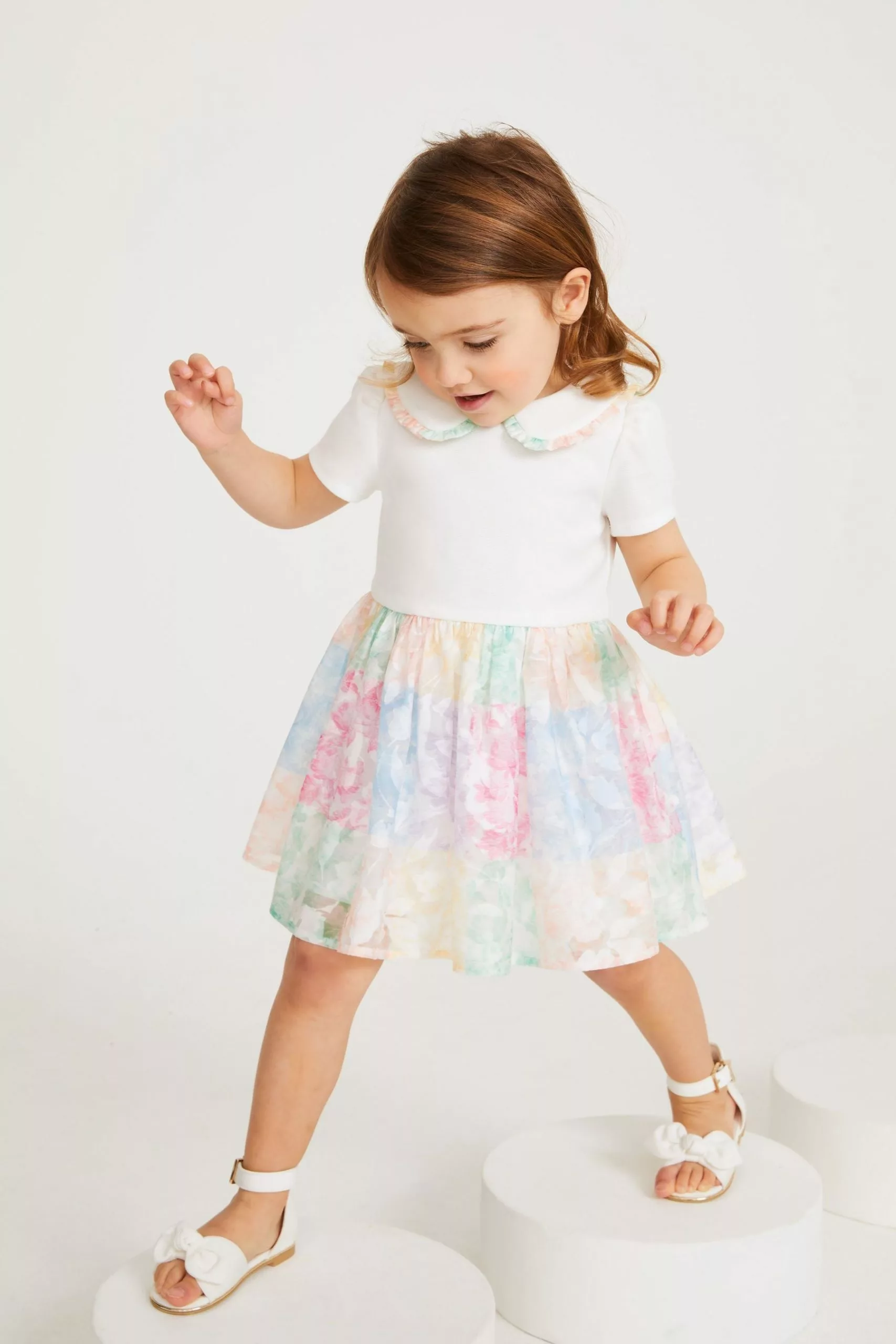 Dress up your little darling in this adorable dress from Baker by Ted Baker. Boasting a mockable top and skirt look, the fresh white bodice has a pretty collar that is trimmed with a charming multicoloured print ruffle detail that matches the skirt. Team it with a pair of pretty sandals to complete the outfit.