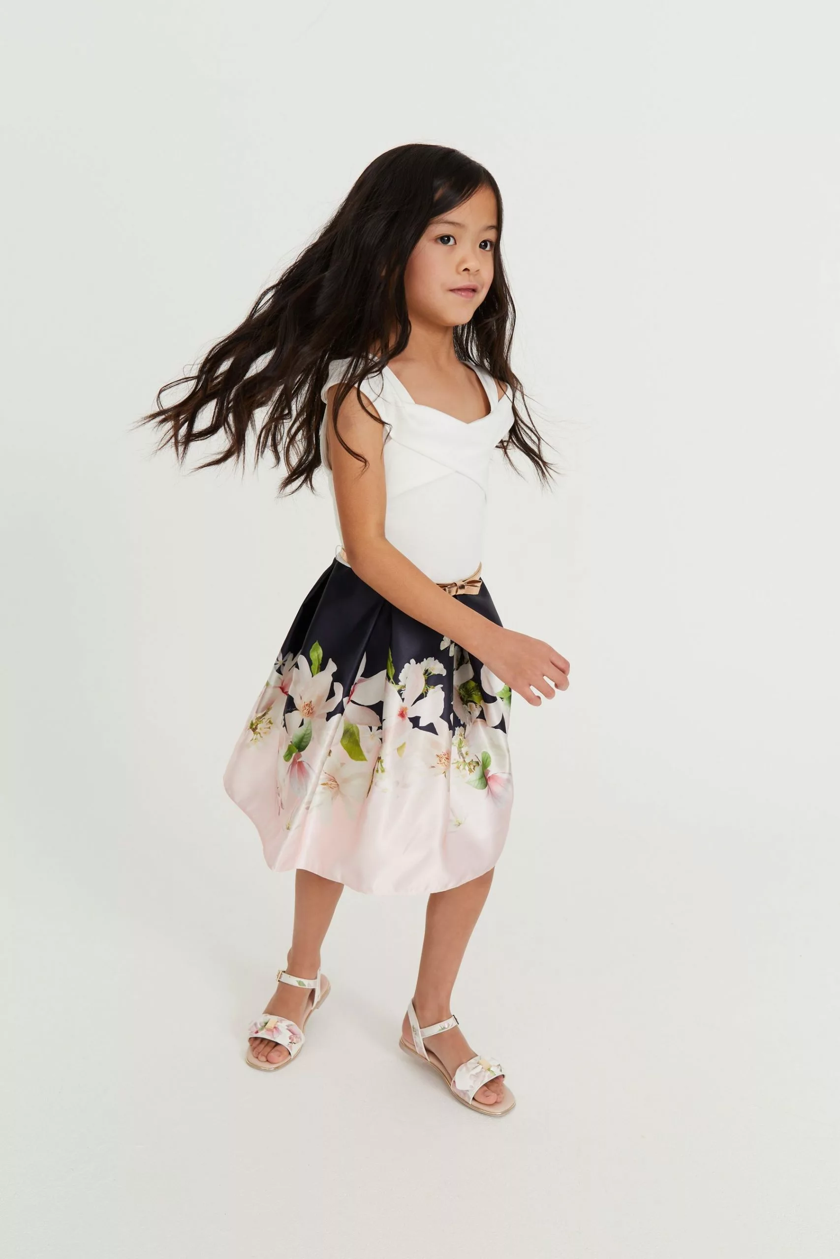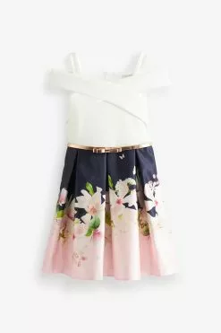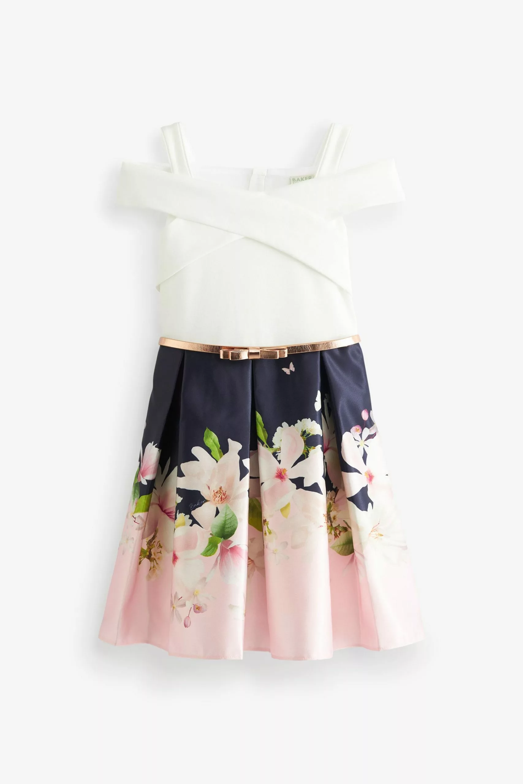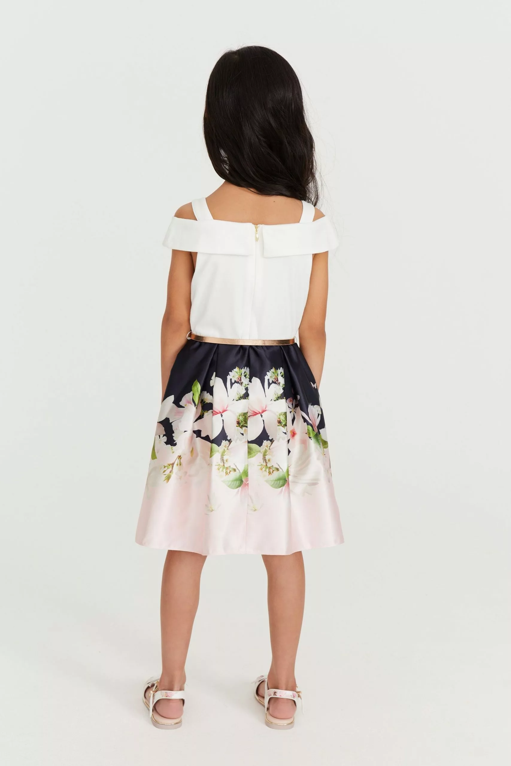 Dress up your little fashionista in style with this beautiful Baker by Ted Baker dress. Boasting a stunning floral printed full skirt with a satin finish, this adorable dress is further complemented with a classic white bodice that has an off the shoulder look with a rose gold belt around the middle that is completed with a bow.