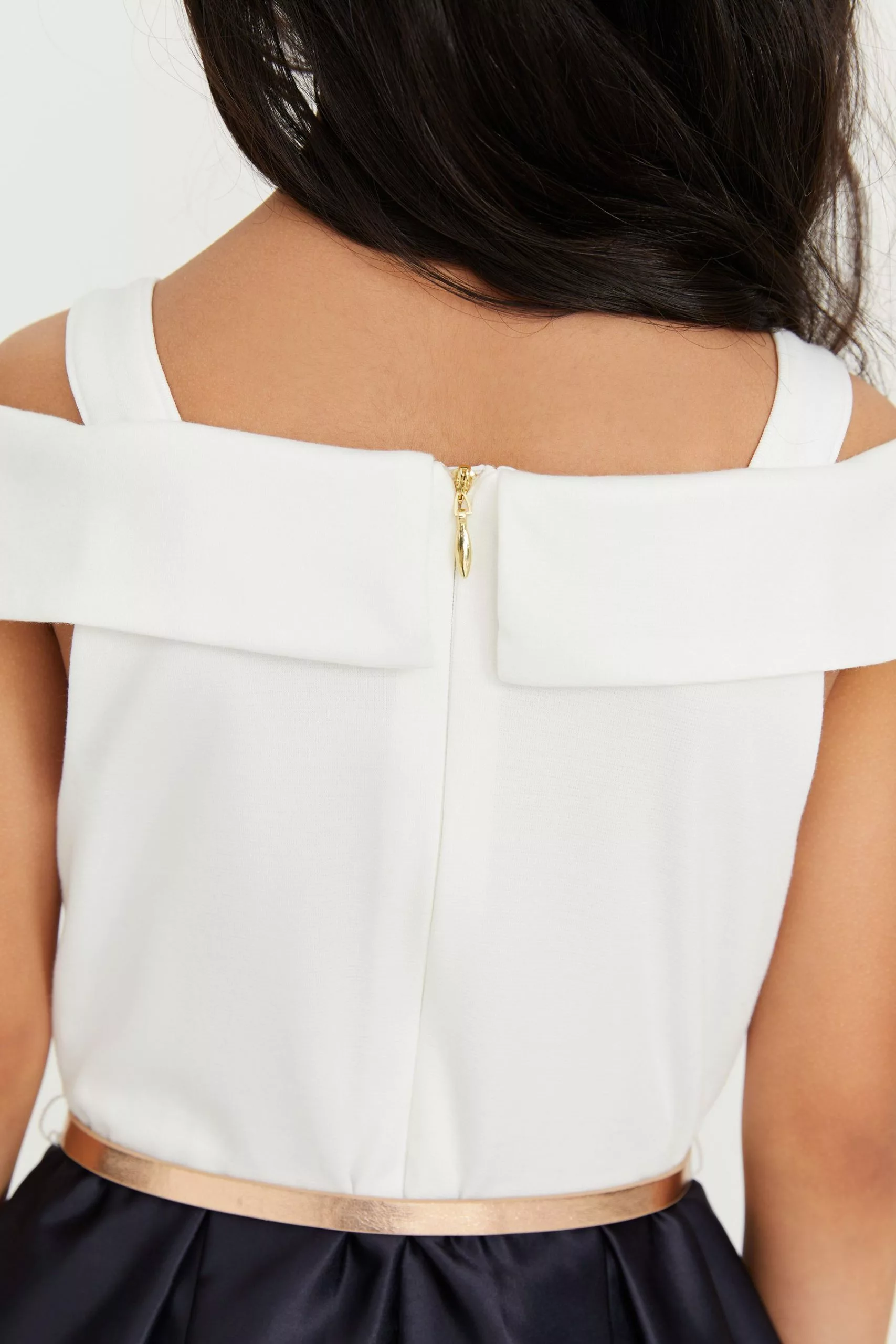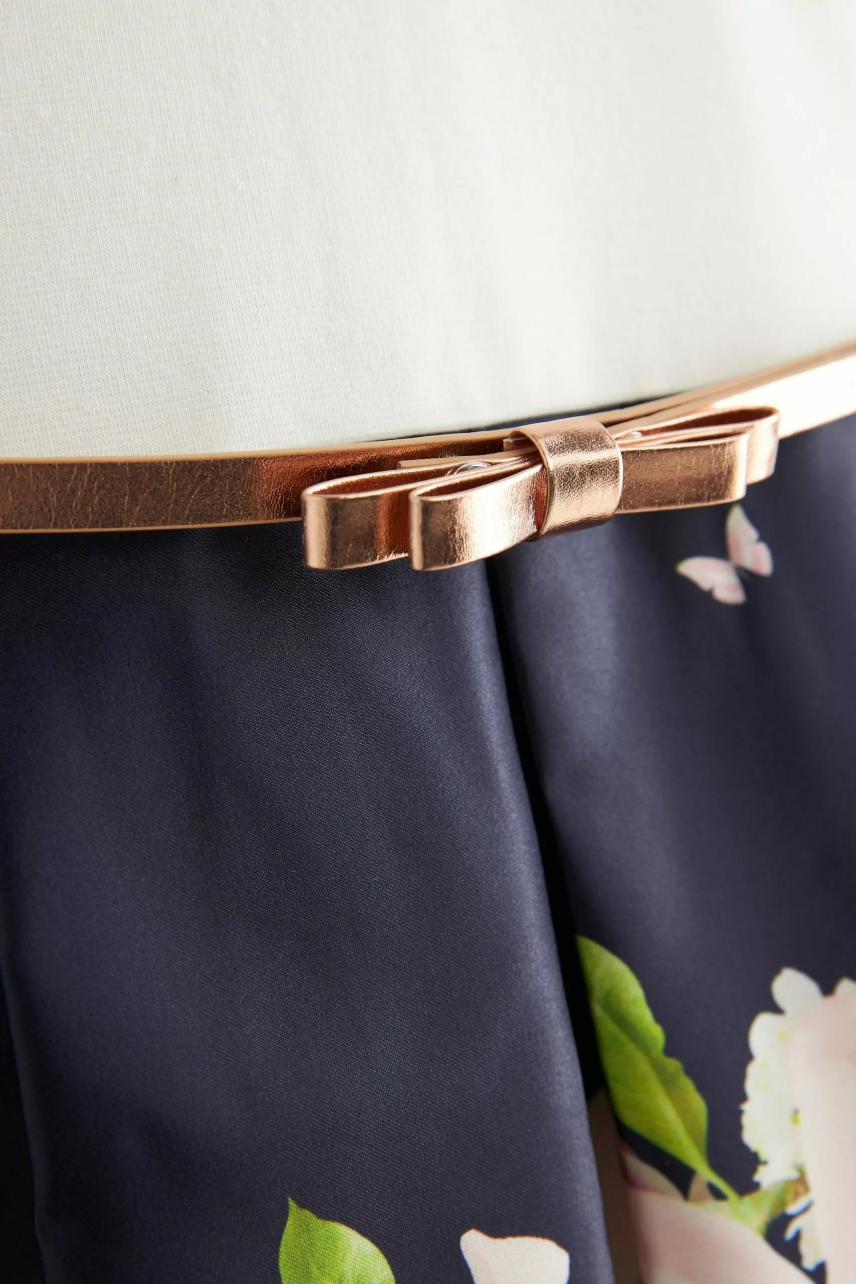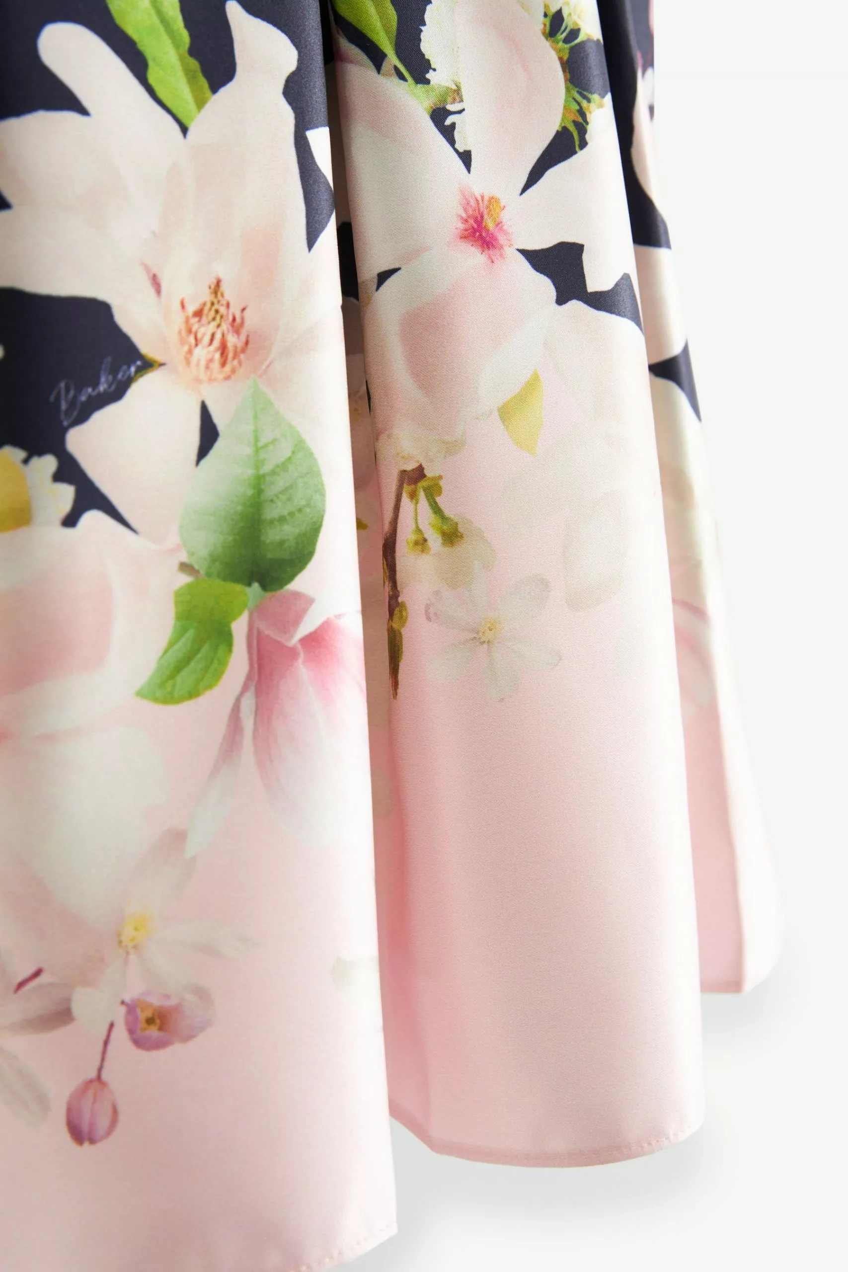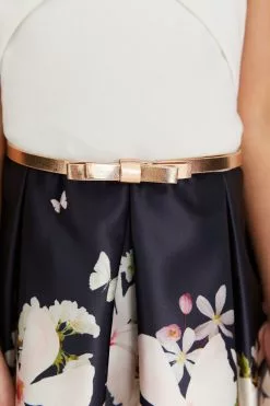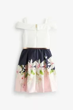 Dress up your little fashionista in style with this beautiful Baker by Ted Baker dress. Boasting a stunning floral printed full skirt with a satin finish, this adorable dress is further complemented with a classic white bodice that has an off the shoulder look with a rose gold belt around the middle that is completed with a bow.