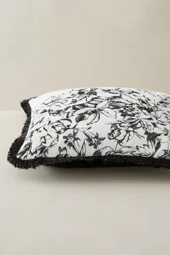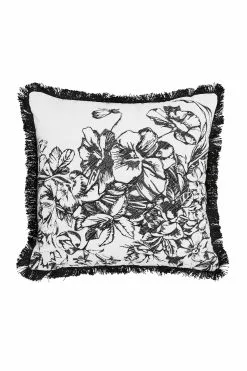 The black and cream embroidered floral cushion in cotton velvet is trimmed with fringed detailing, adding further interest.