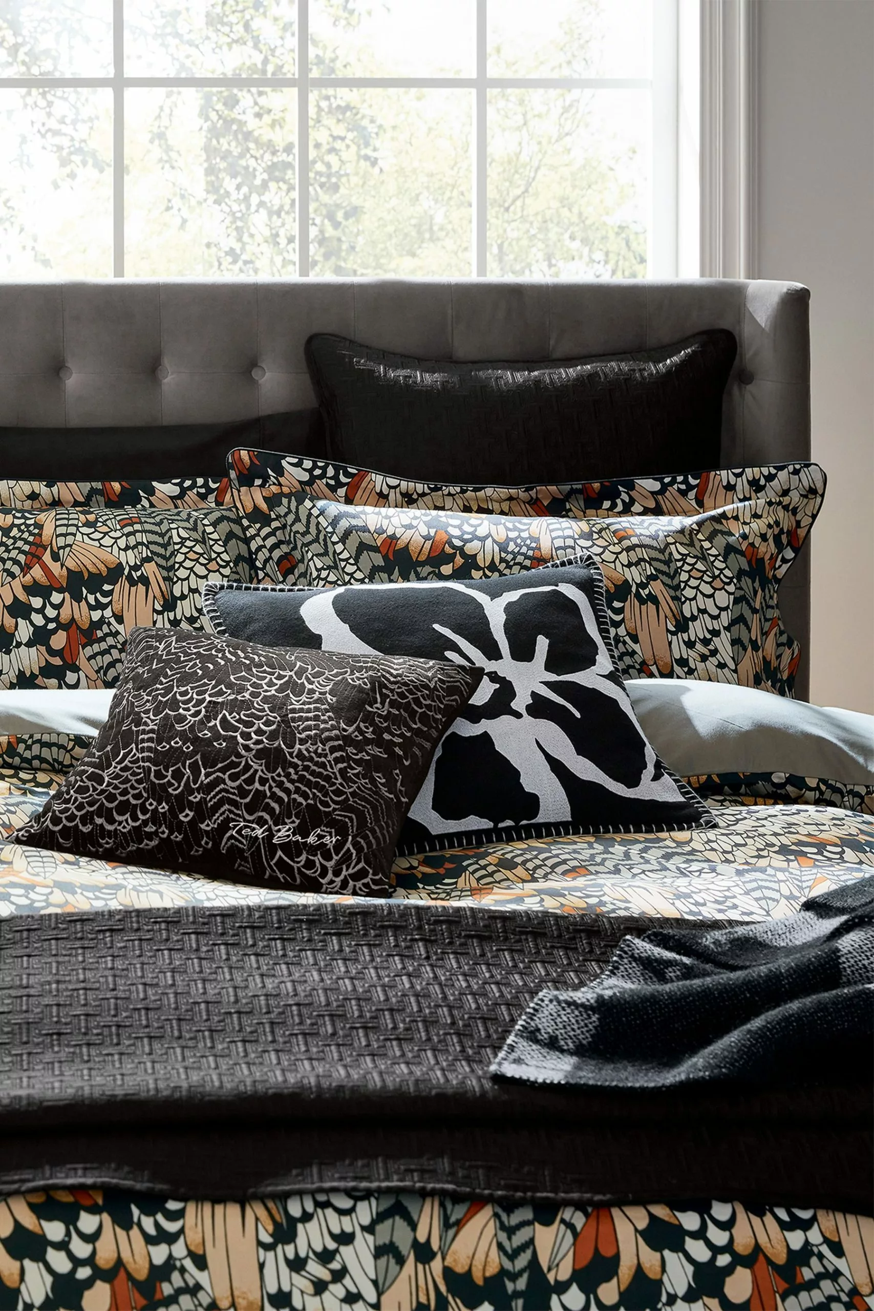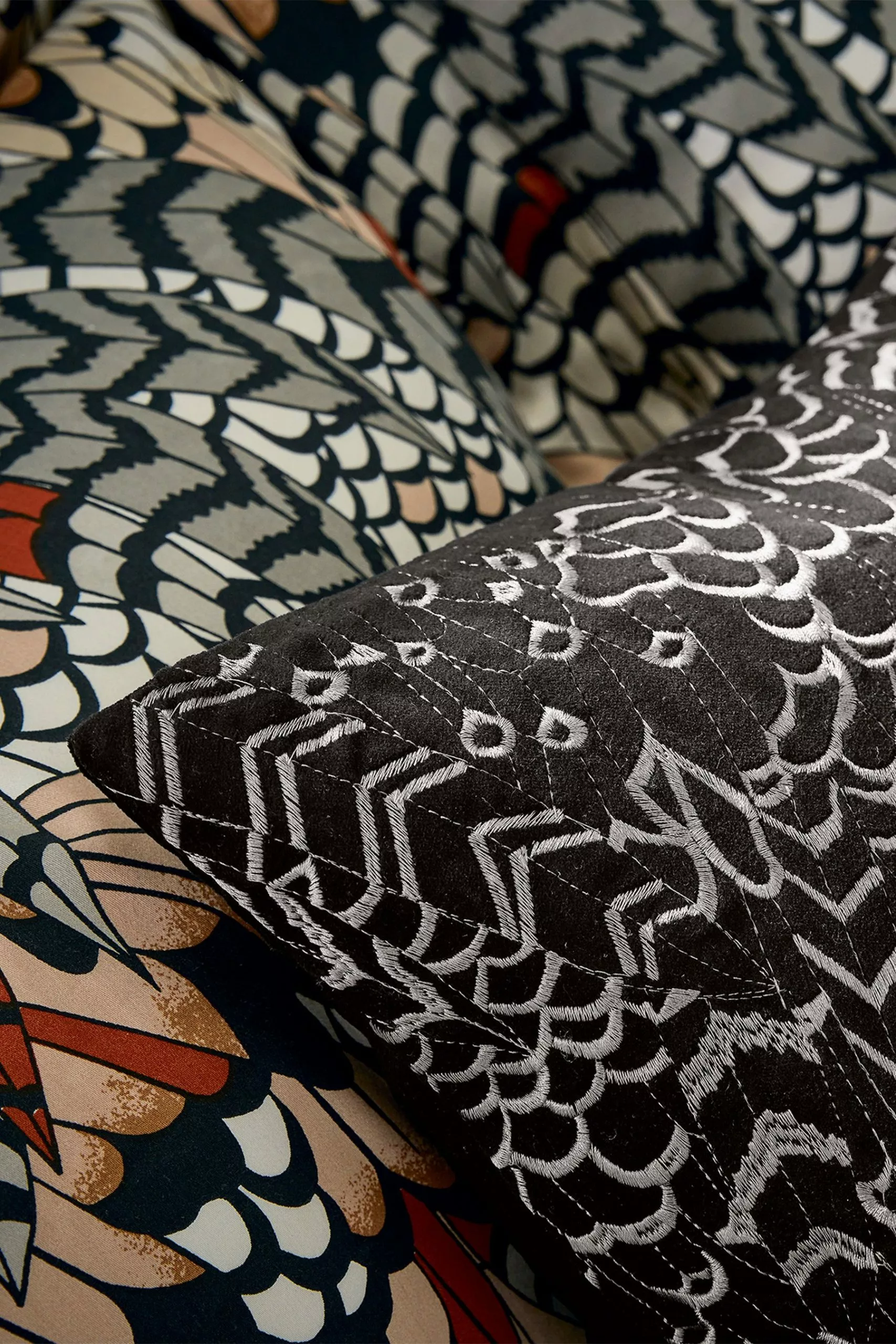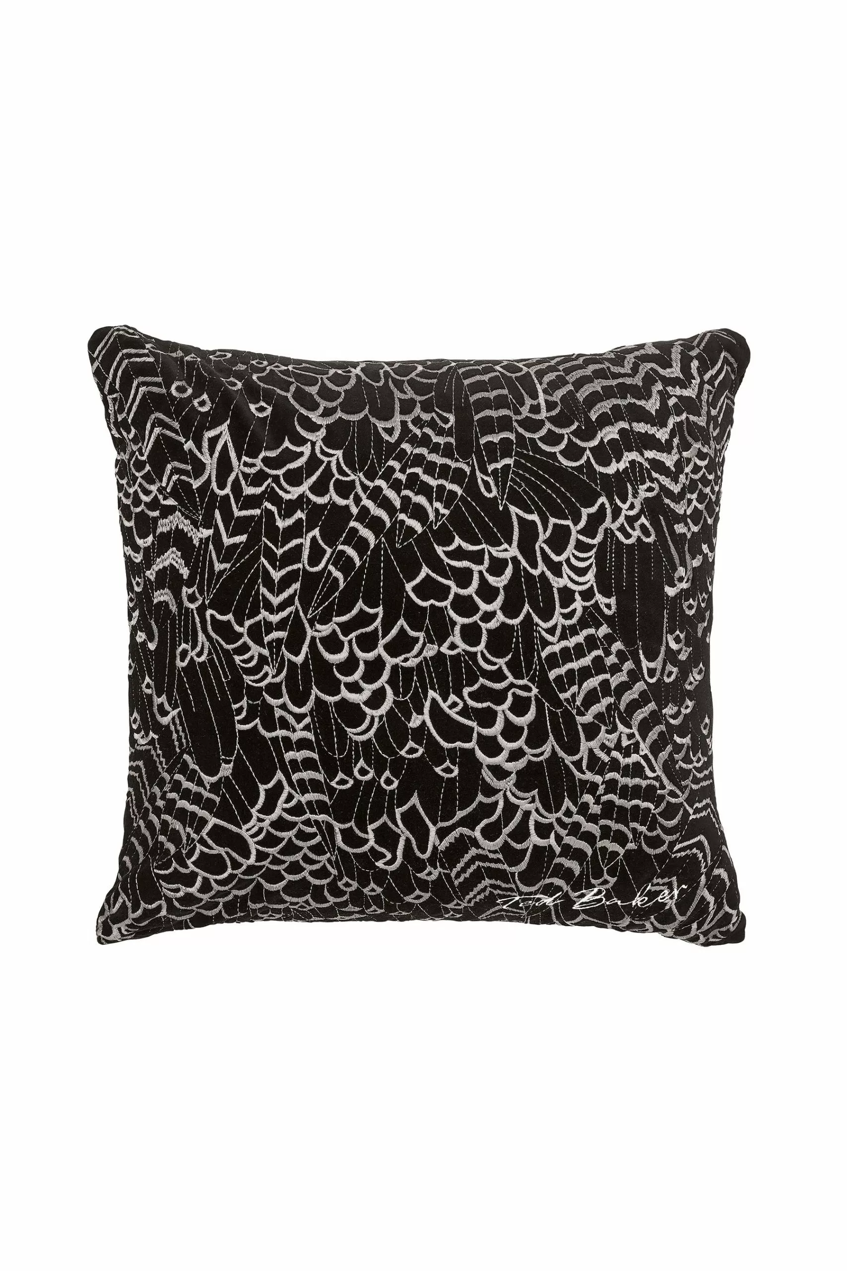 Add sumptuous luxe with the 100% cotton velvet cushion with embroidered feather design, highlighted with metallic thread.