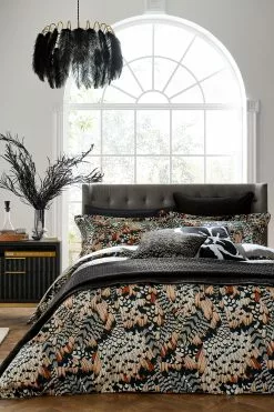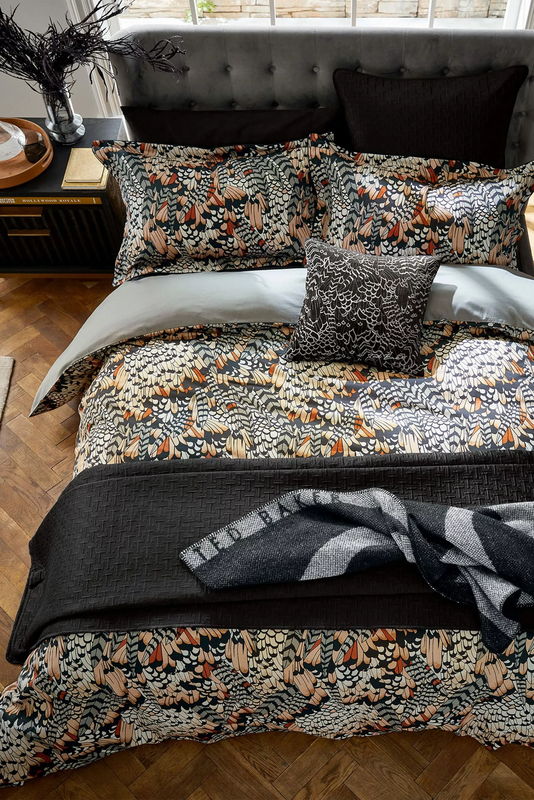 An intricate all over feather print exuding daring opulence. The detailed feathers pop in shades of black, cream, brown and orange for a cosy autumnal feel. The bedding reverse is kept simple in plain black.