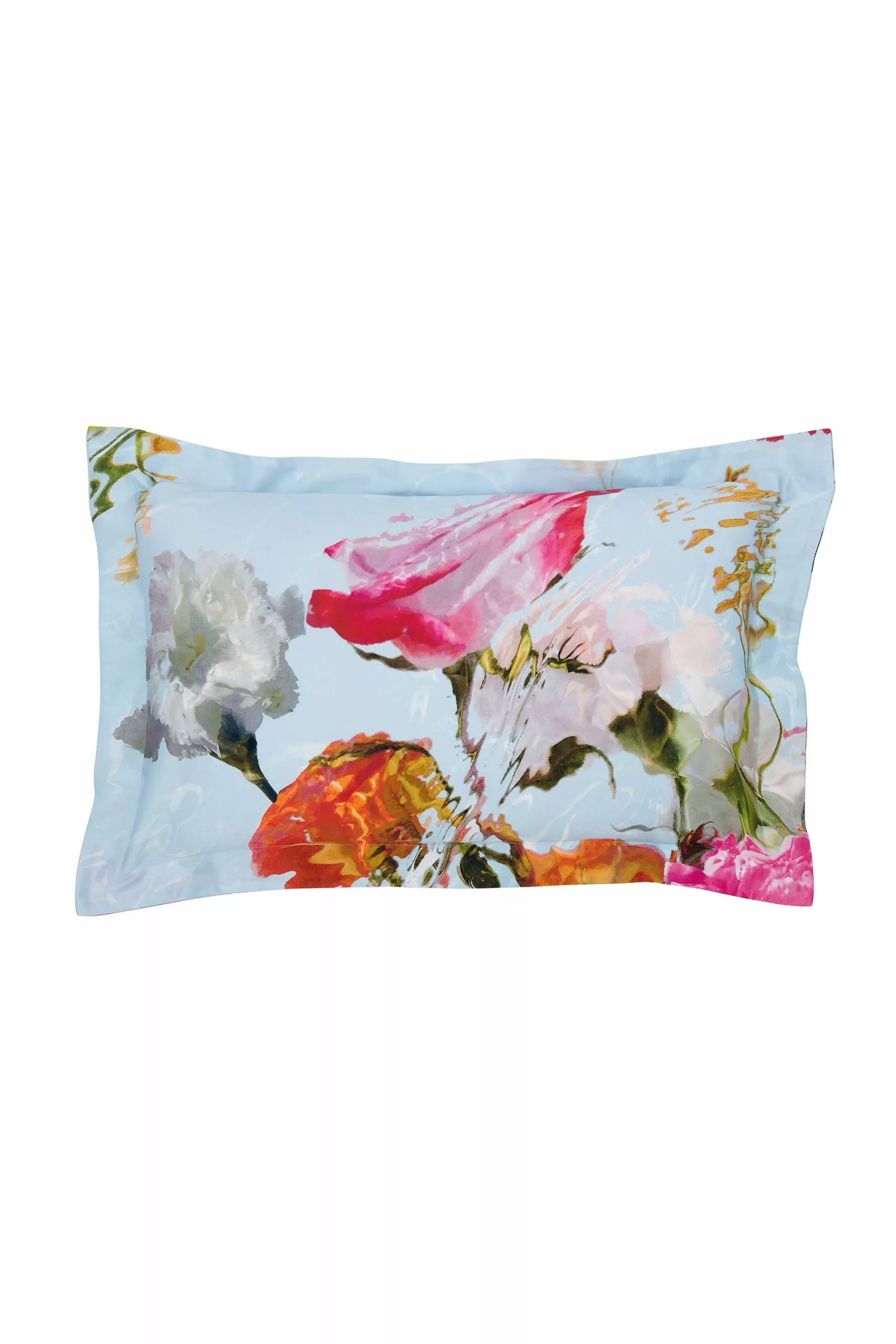 Add some drama to your bedroom with this striking large scale photographic floral print, coloured in a vibrant palette of deep pink, orange and red tones, floating on a pale blue ground. Digitally printed on 220 thread count cotton sateen and paired with a plain blue reverse.