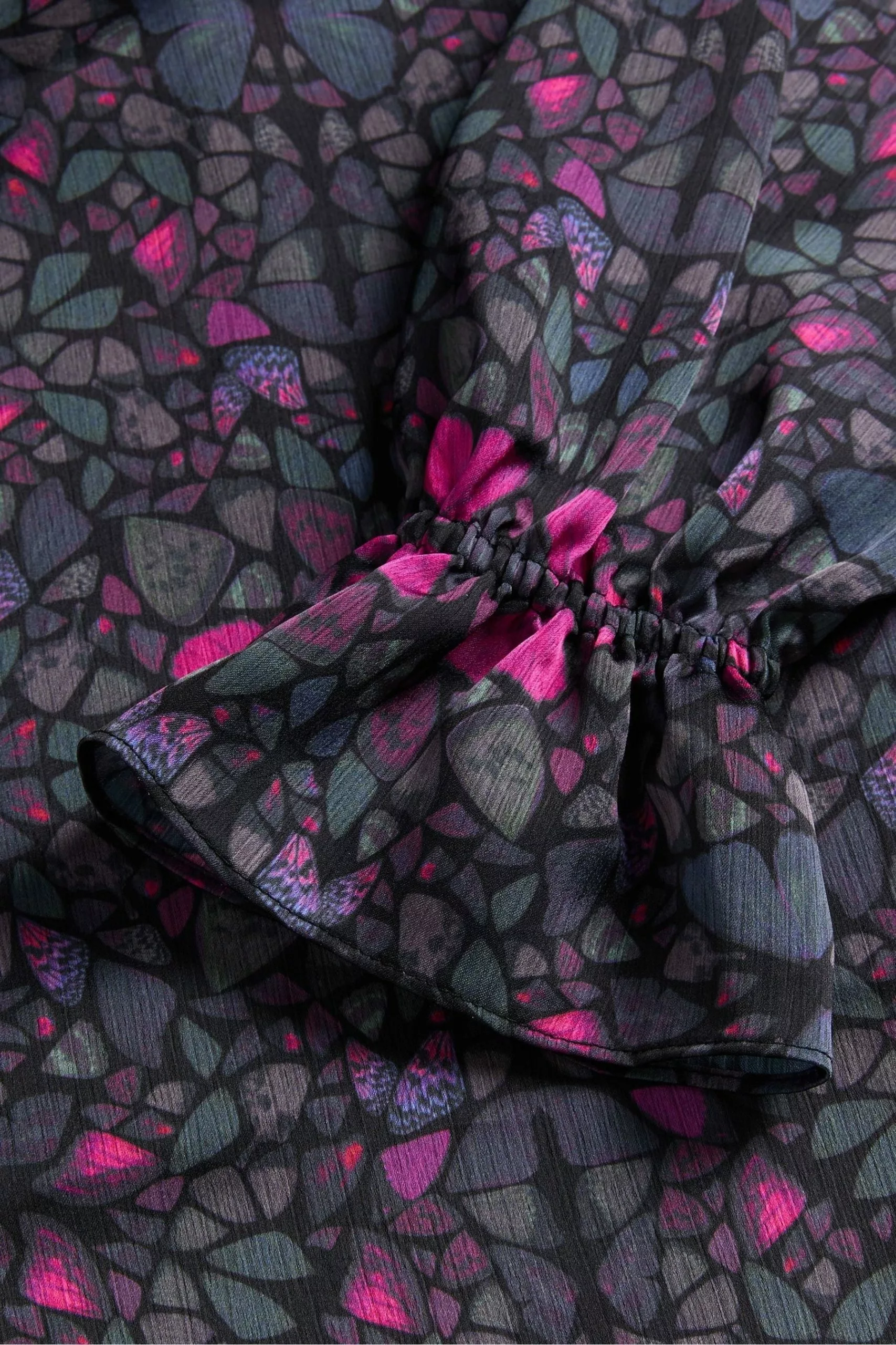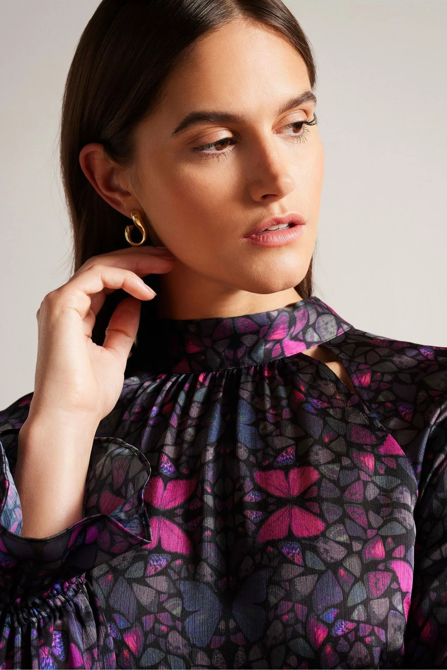 Prepare to be seen and admired in the beautiful HEIYDII blouse. Featuring our kaleidoscope butterfly print and a bold silhouette with a high neck and cut-outs, this flattering number will see you through from day to night. The fabric of this product is made of 100% recycled polyester. Using recycled polyester helps divert plastic waste from ending in landfills and helps us to reduce our dependence on virgin materials.