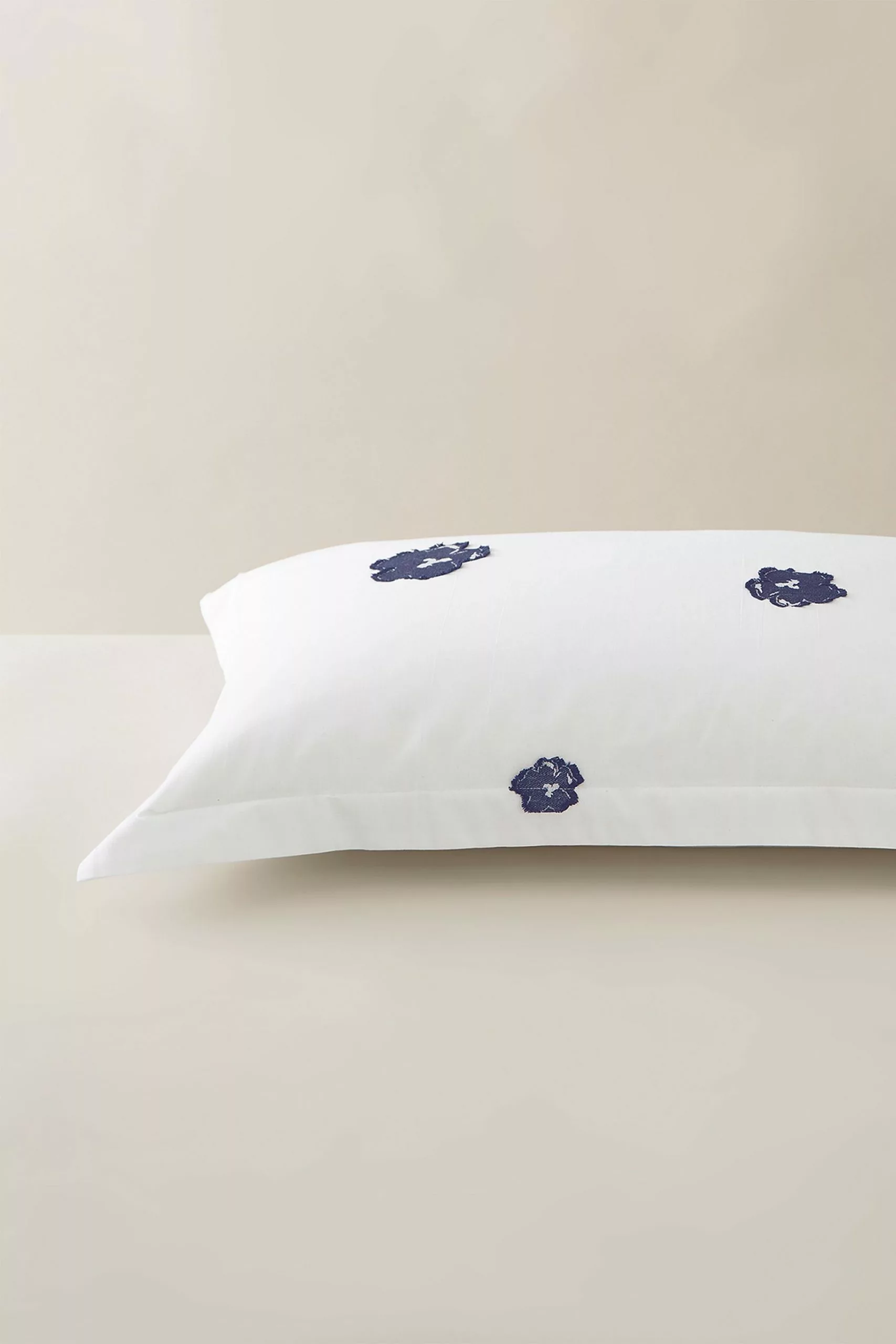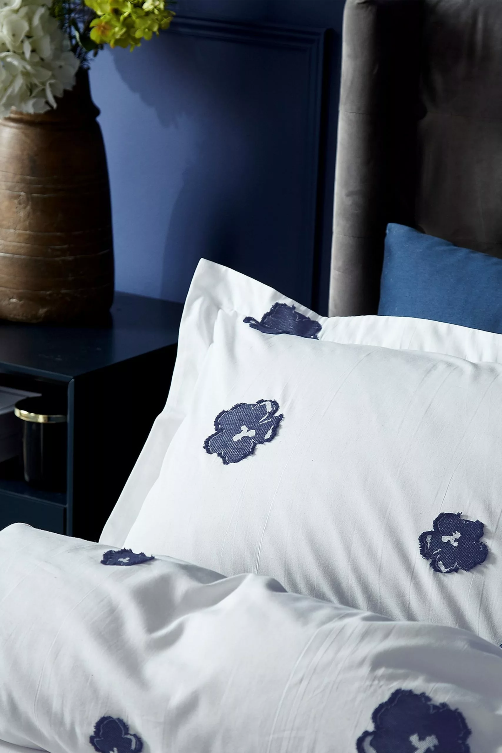 A beautiful, clipped jacquard design with navy magnolia flowers placed on a crisp white base. The yarn dyed flowers pop across the design.