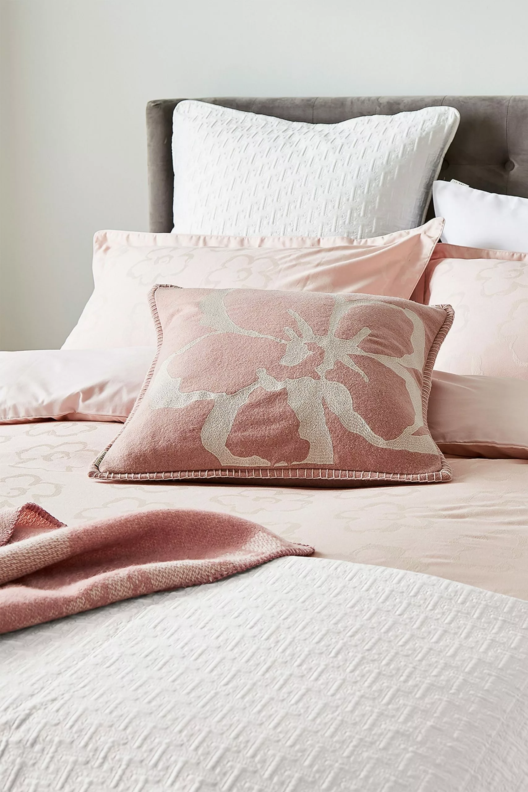 A yarn-dyed cotton jacquard design with all-over magnolia print in homely blush pink. Coordinate the look with the quilted T sham, cushion and quilted white throw.