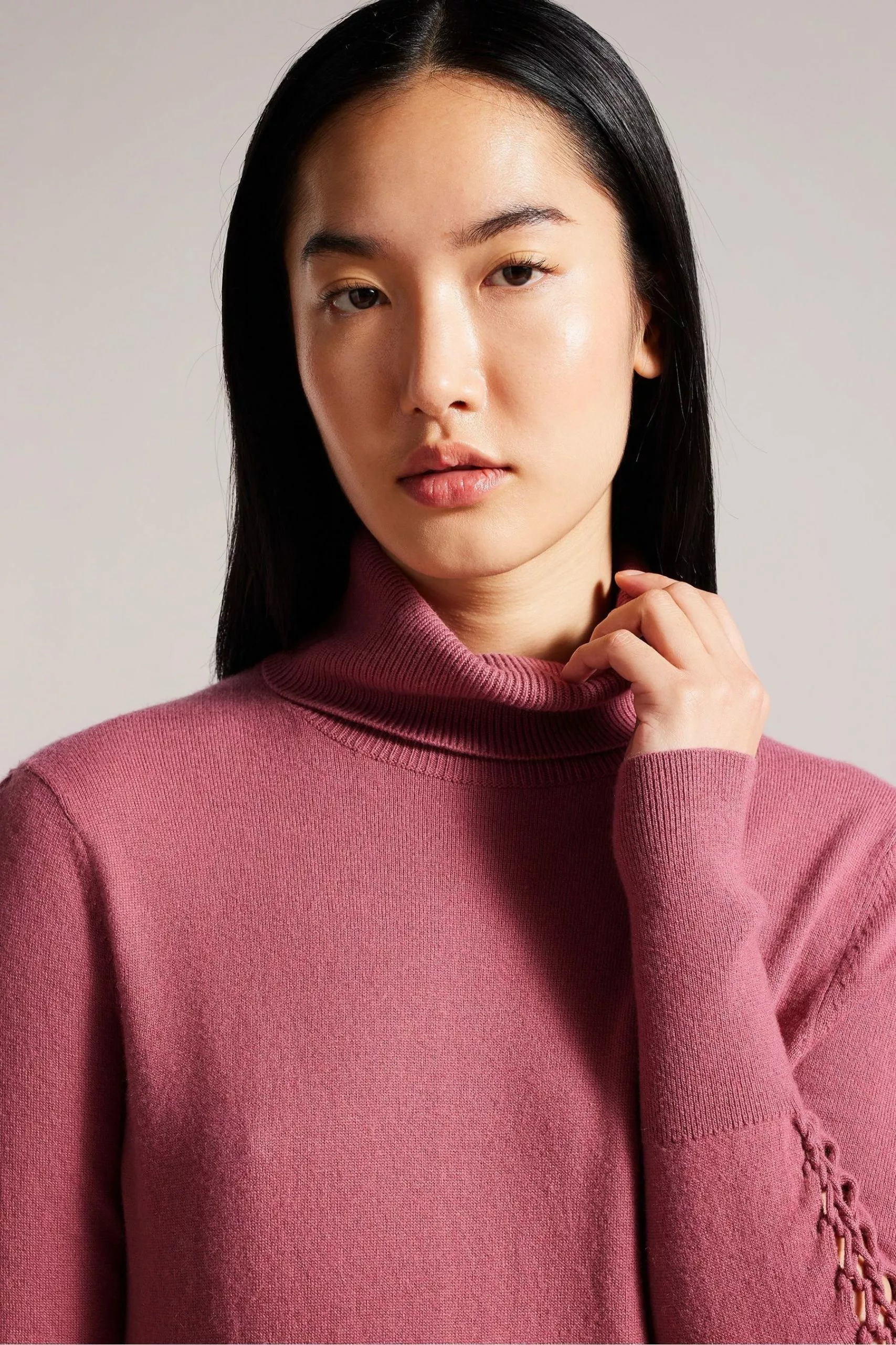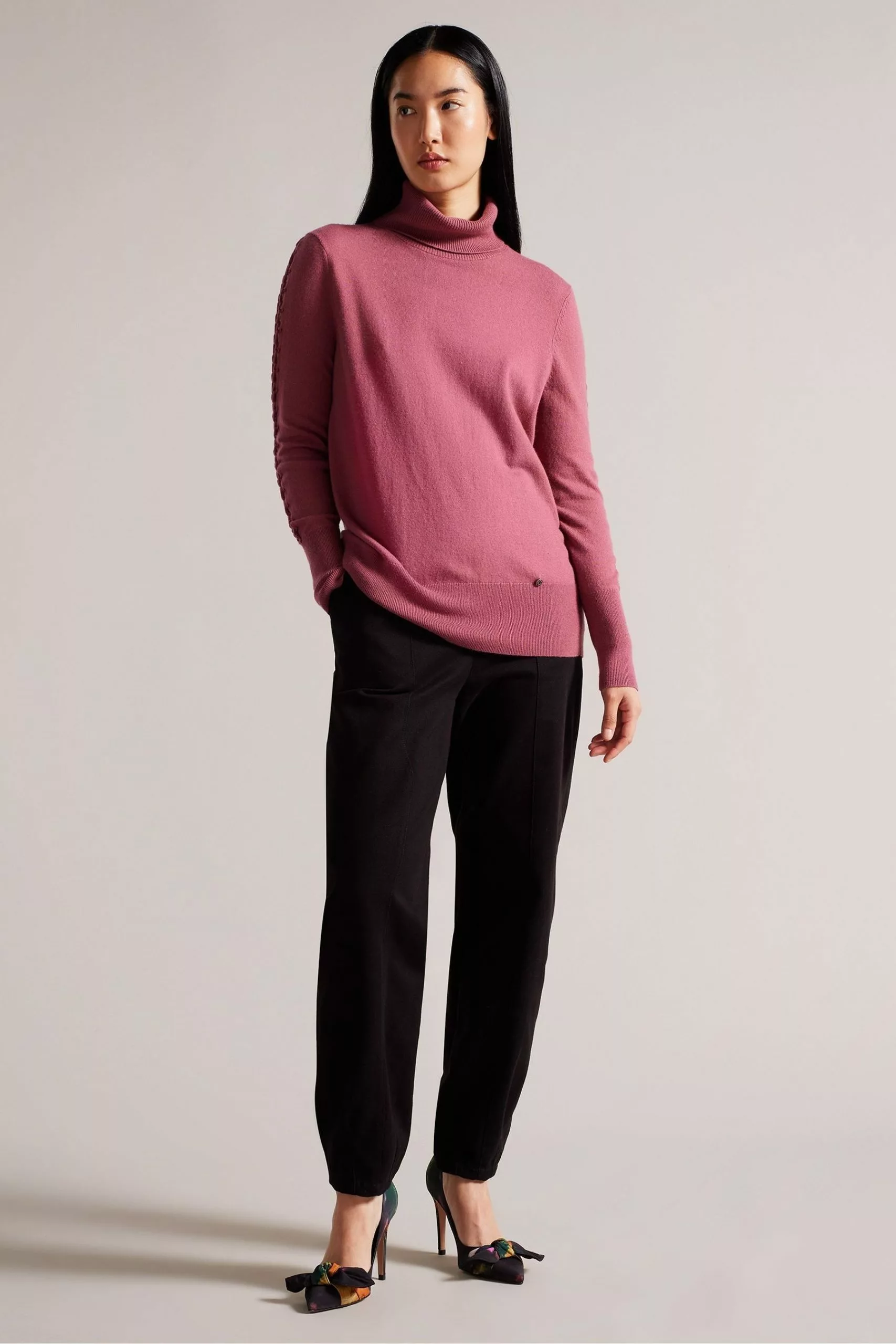 There’s a reason why everyone loves a great knit. In a wool and cashmere blend, MAEVIA is soft and comfortable against your skin. Braided sleeve inserts and a cosy roll neck offer a sophisticated look that feels as great as it looks. By choosing Ted Baker cotton products, you’re supporting our investment in the Better Cotton Initiative mission. This product is sourced via a system of mass balance and therefore may not contain Better Cotton.
